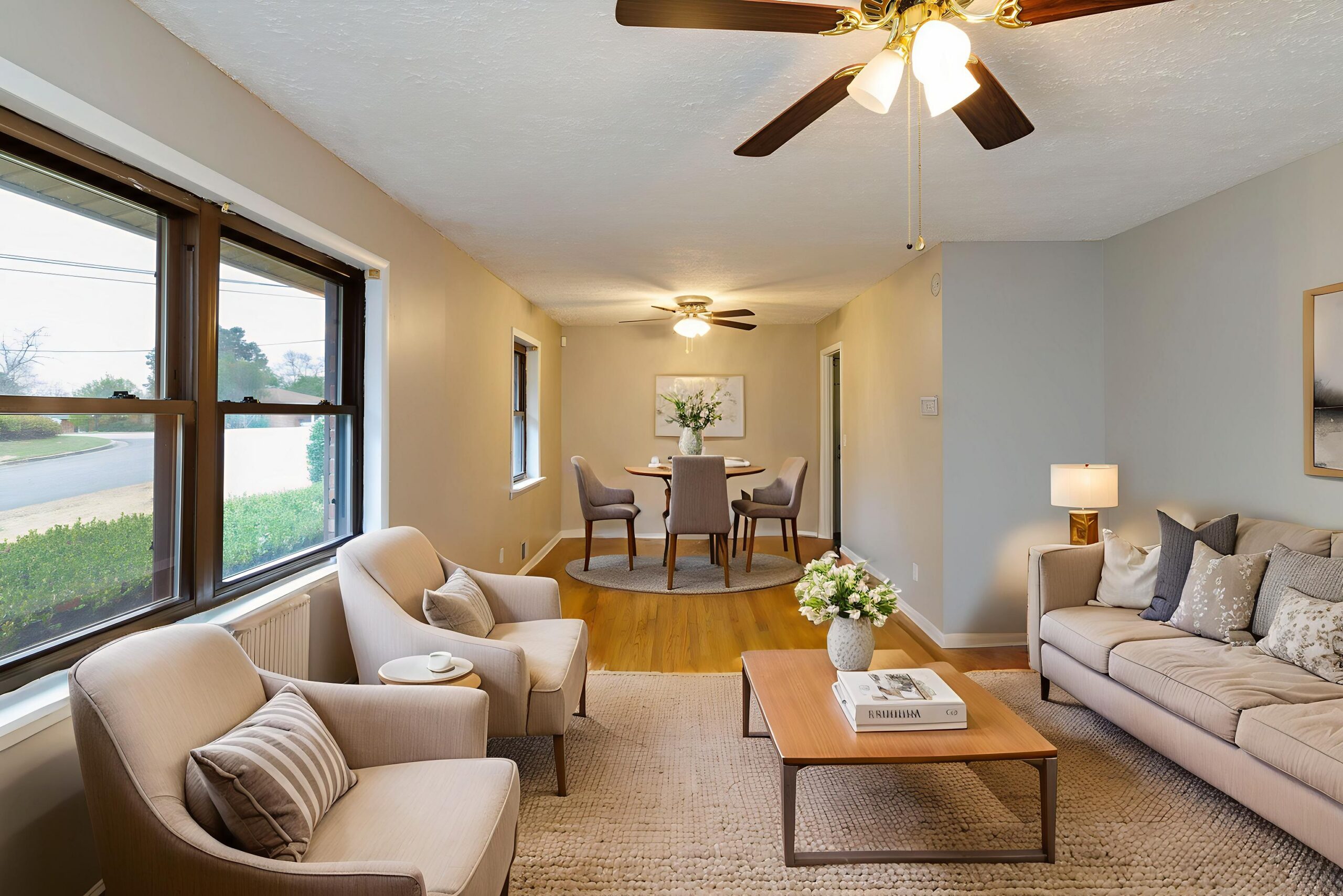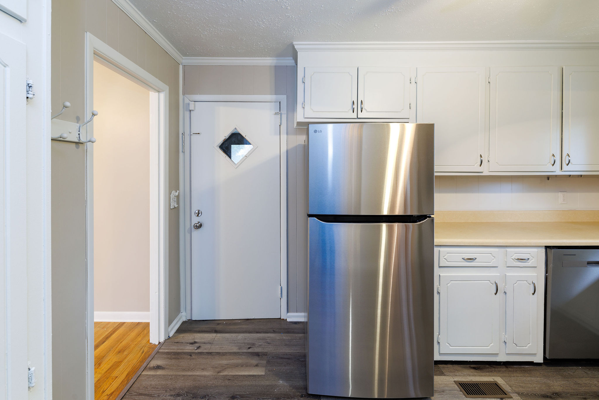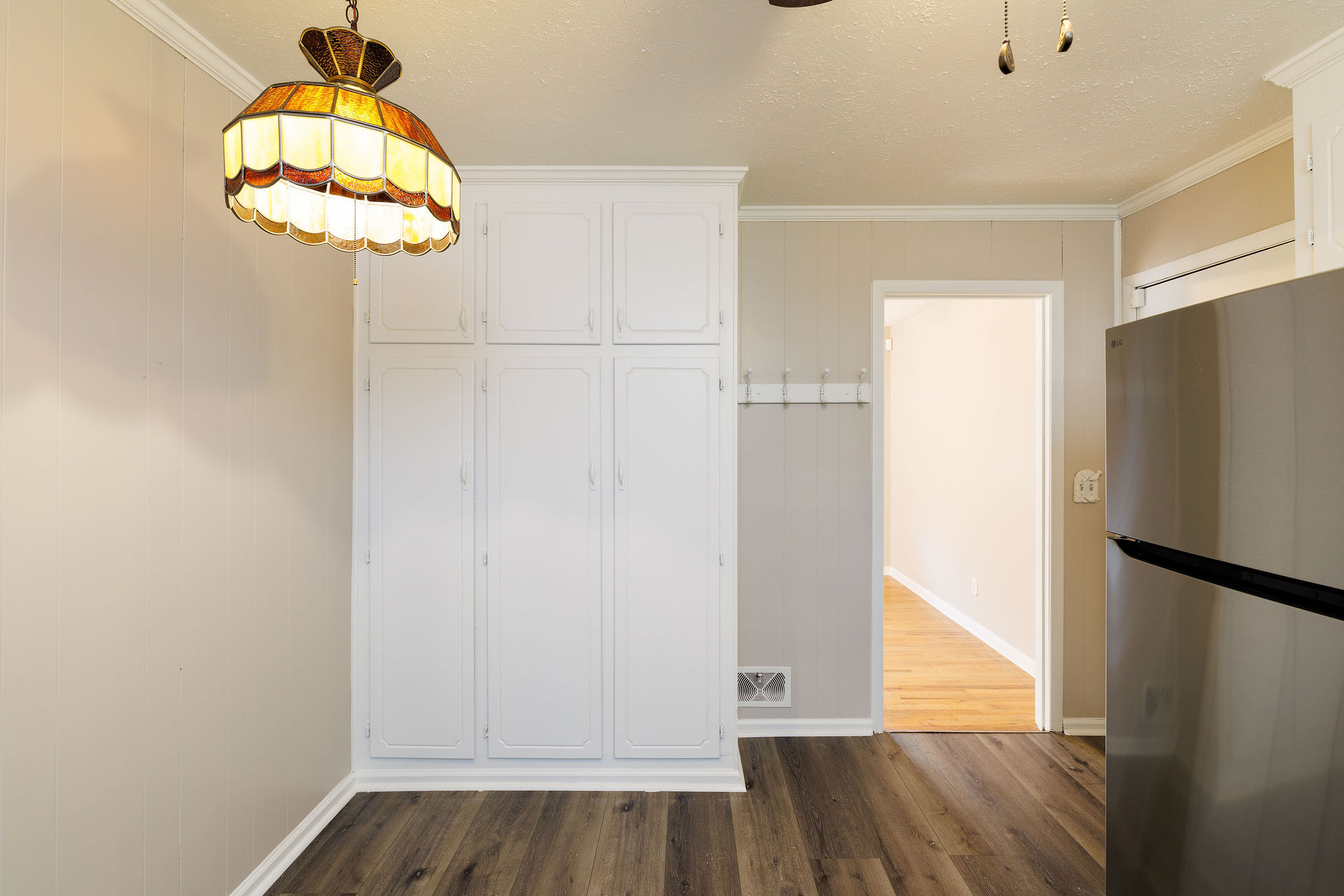 The updated eat-in kitchen shines with brand-new stainless steel appliances and refinished white cabinetry, blending modern upgrades with timeless charm. All bedrooms include ceiling fans for added comfort, while the primary suite offers its own private ensuite bath for a peaceful escape. A brand-new hot water heater provides additional value and peace of mind.