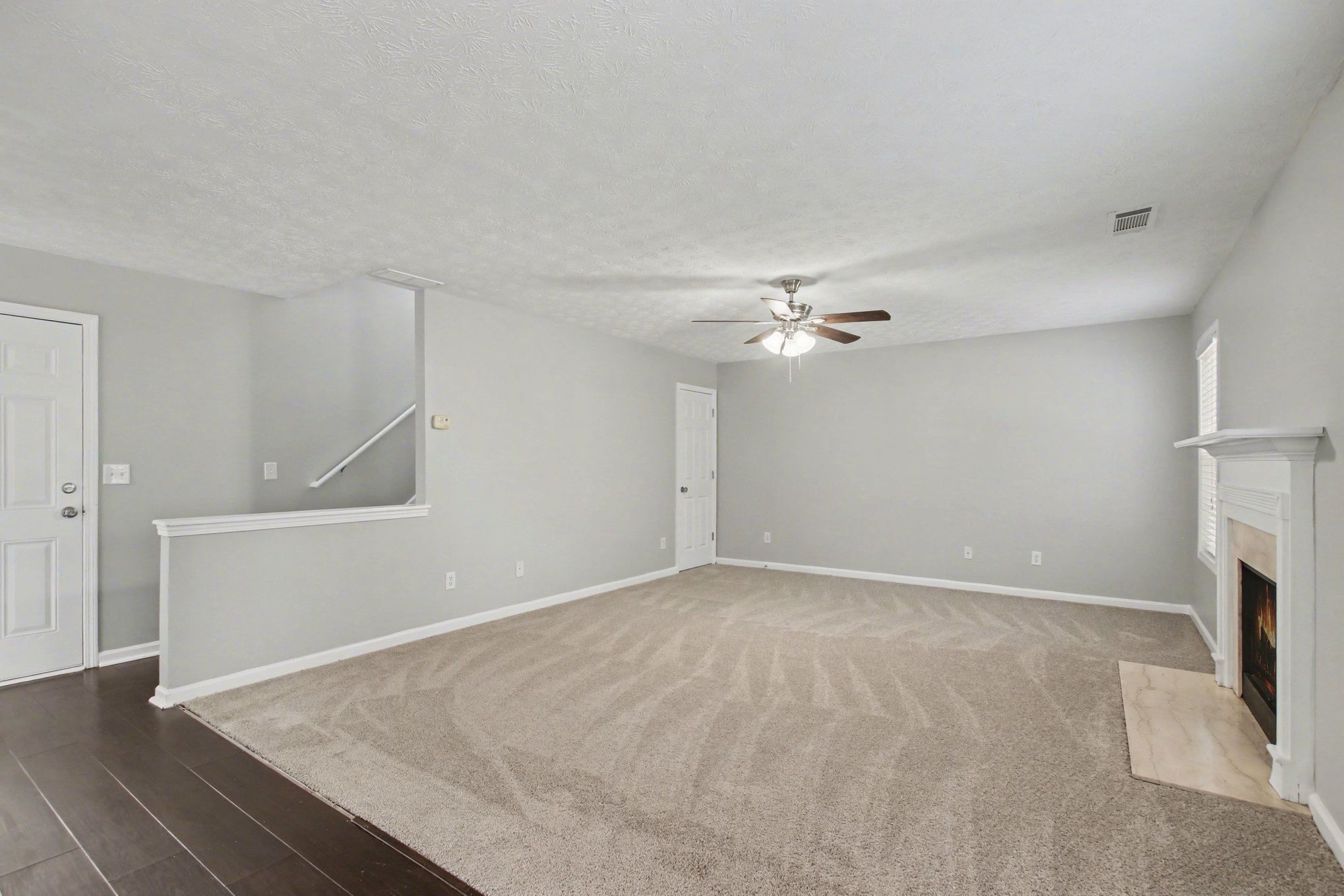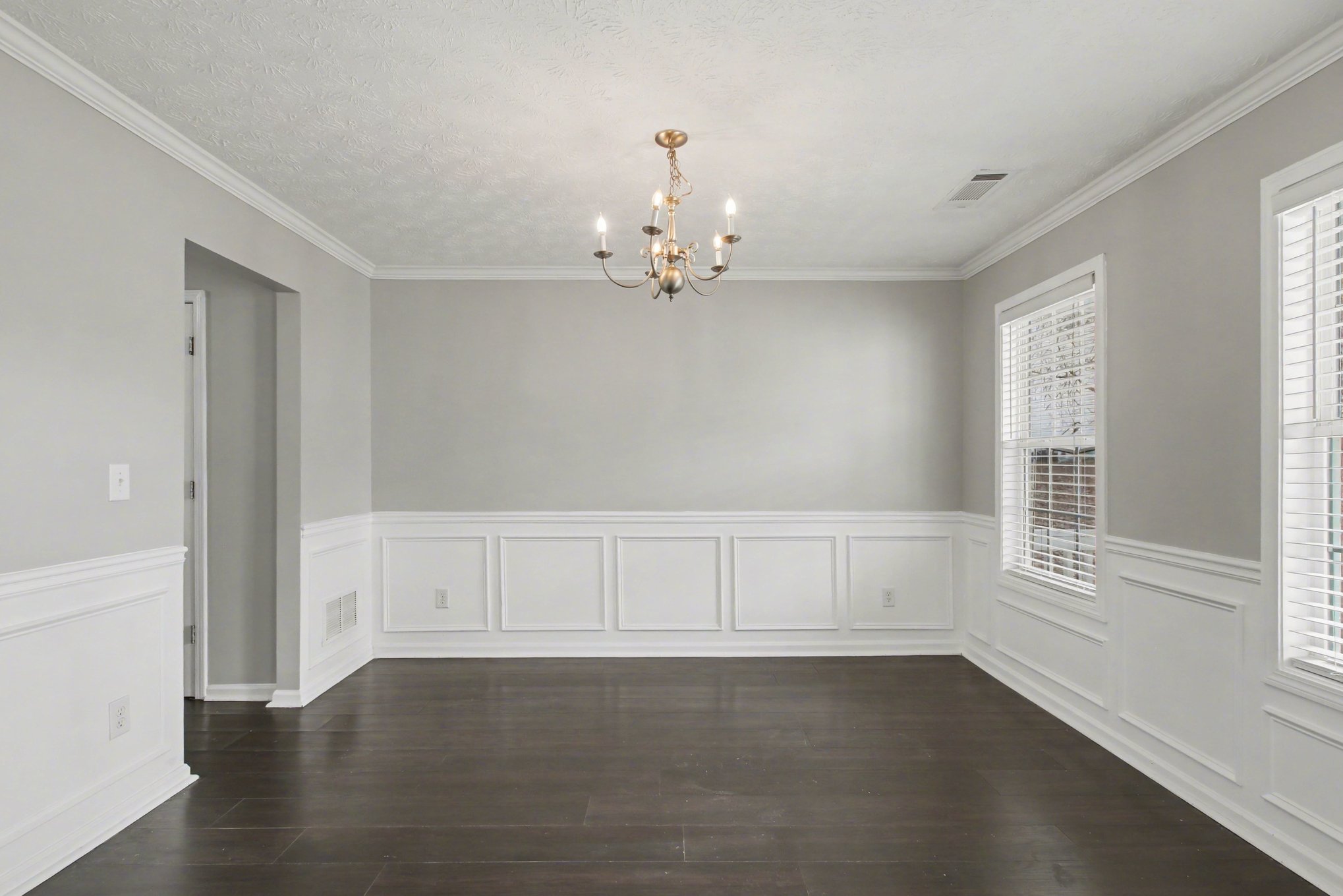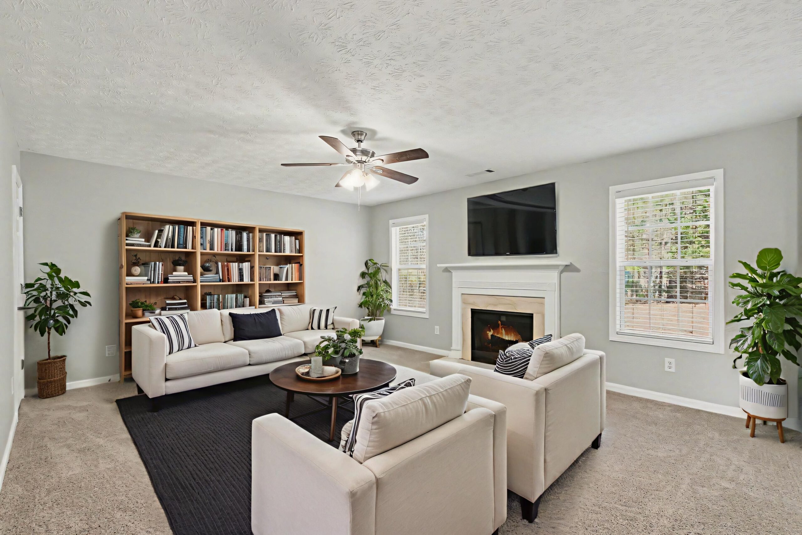 The spacious living room with a cozy fireplace provides a warm gathering space, while the formal dining room with decorative wainscoting adds timeless character for hosting dinners and special occasions.