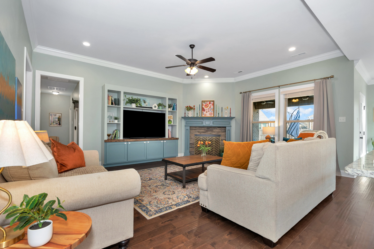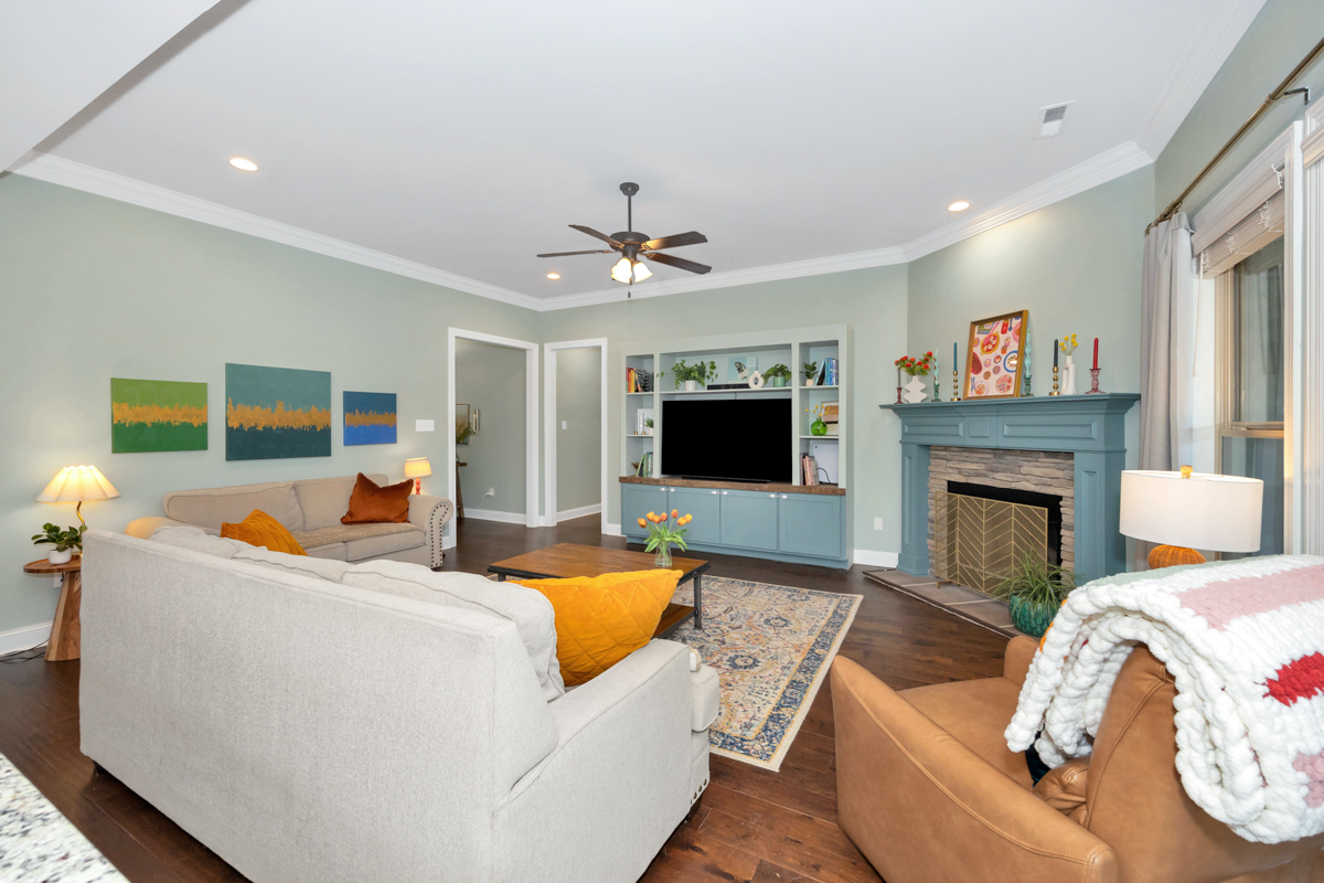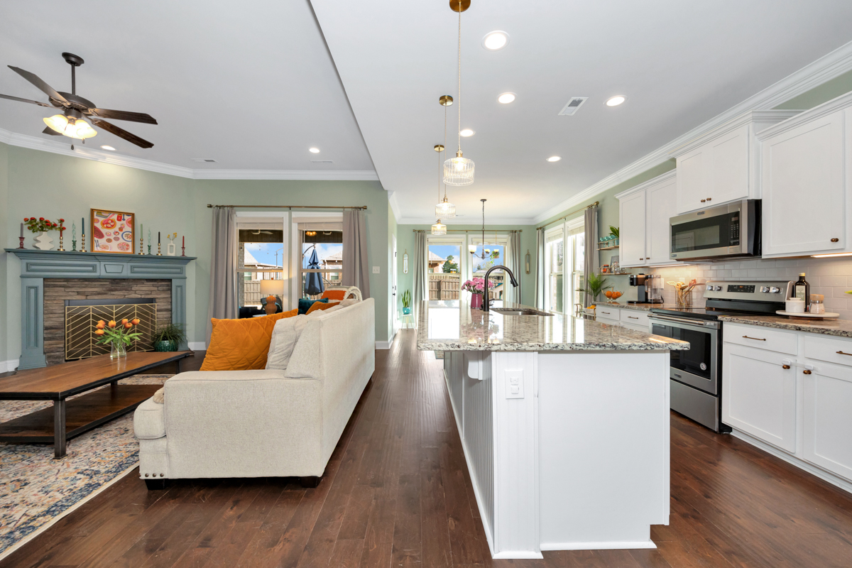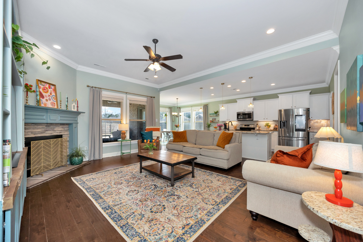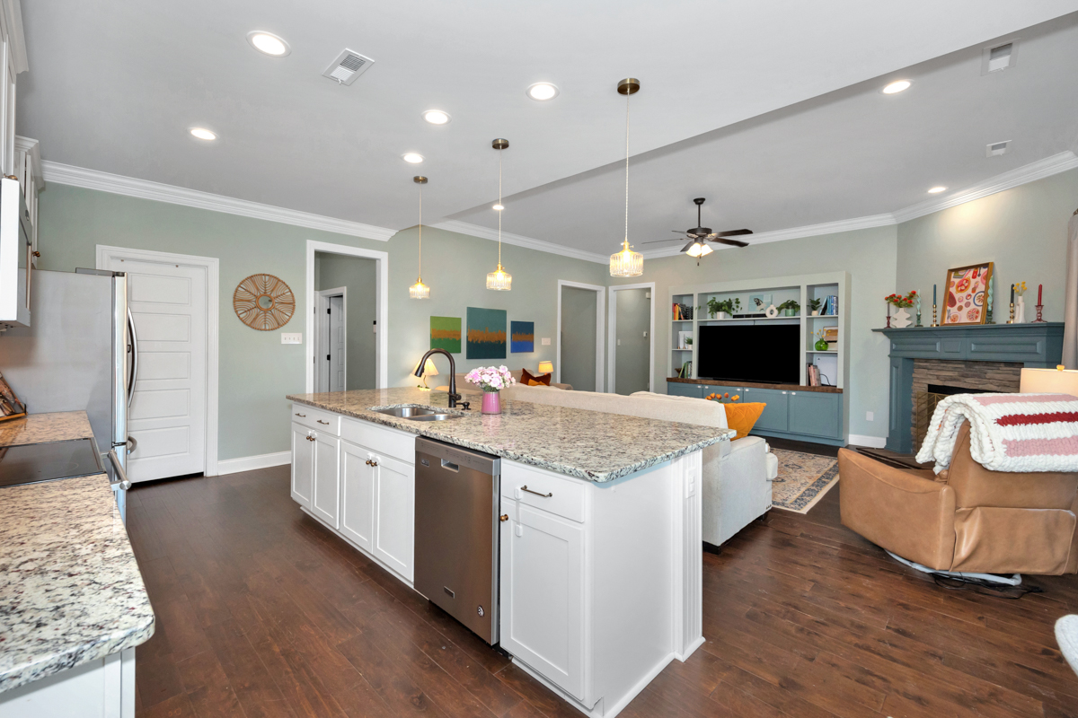 Step inside to an inviting open-concept layout featuring crown molding, recessed lighting, and durable wood-look flooring throughout the main living areas. The spacious living room is anchored by a cozy corner wood-burning fireplace, creating the perfect space for relaxing or entertaining.