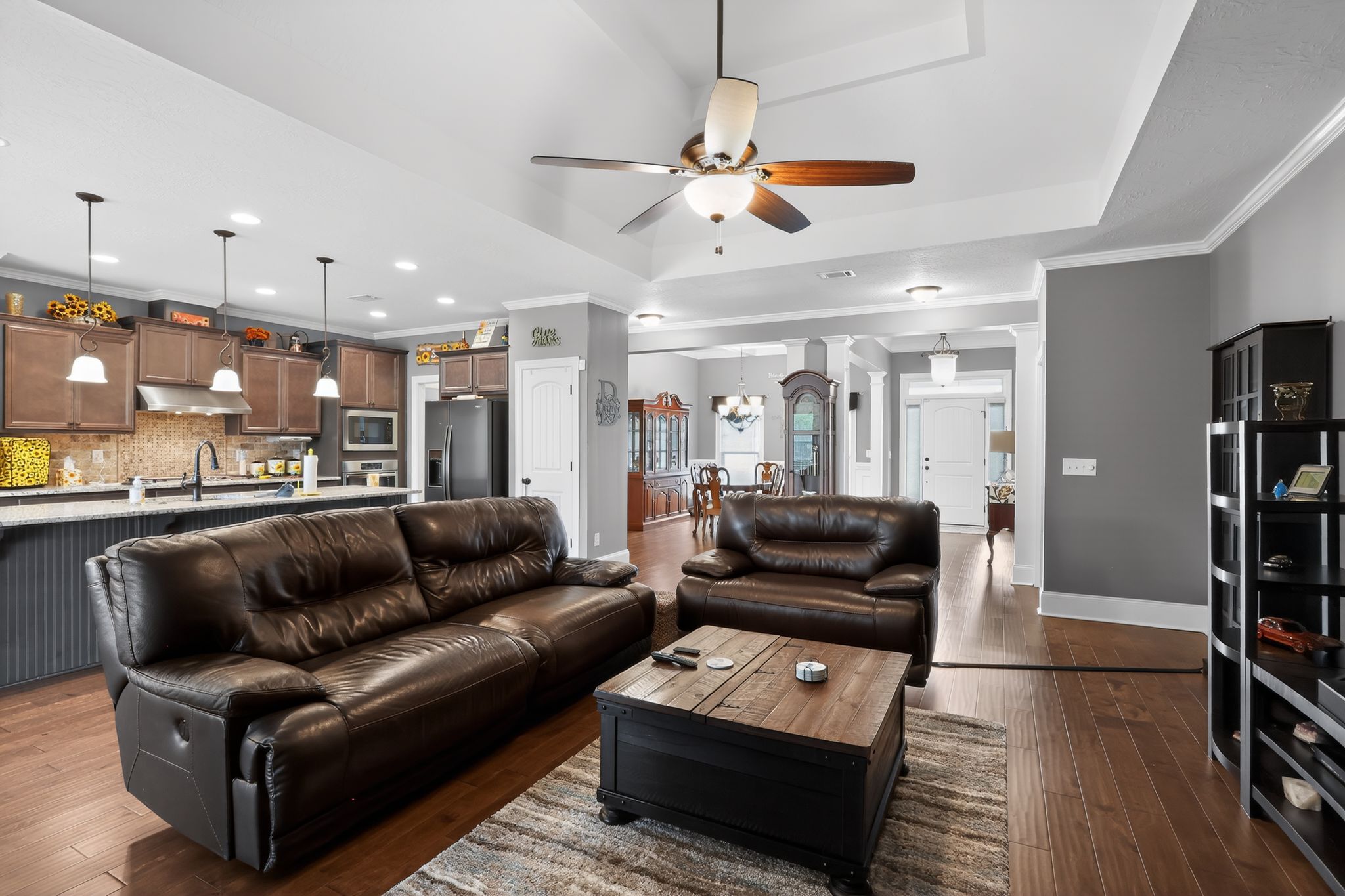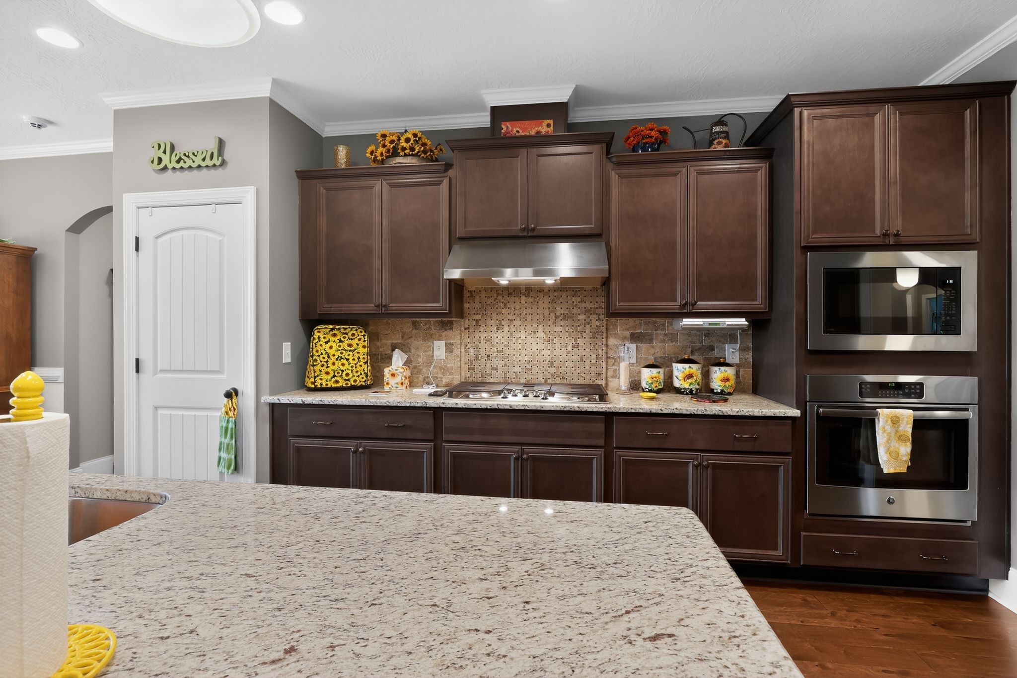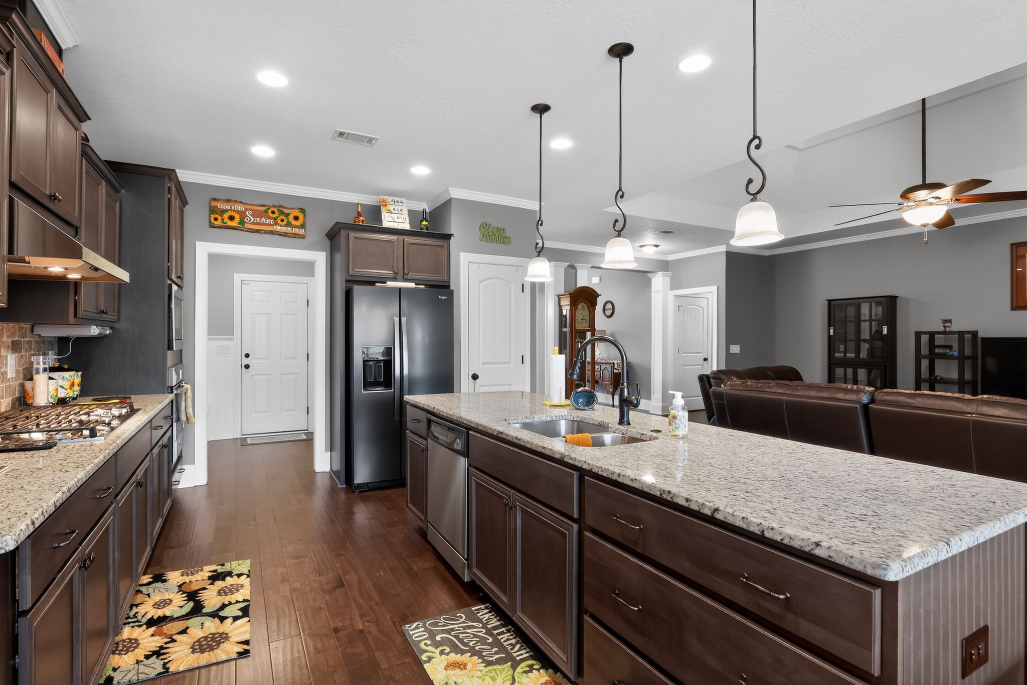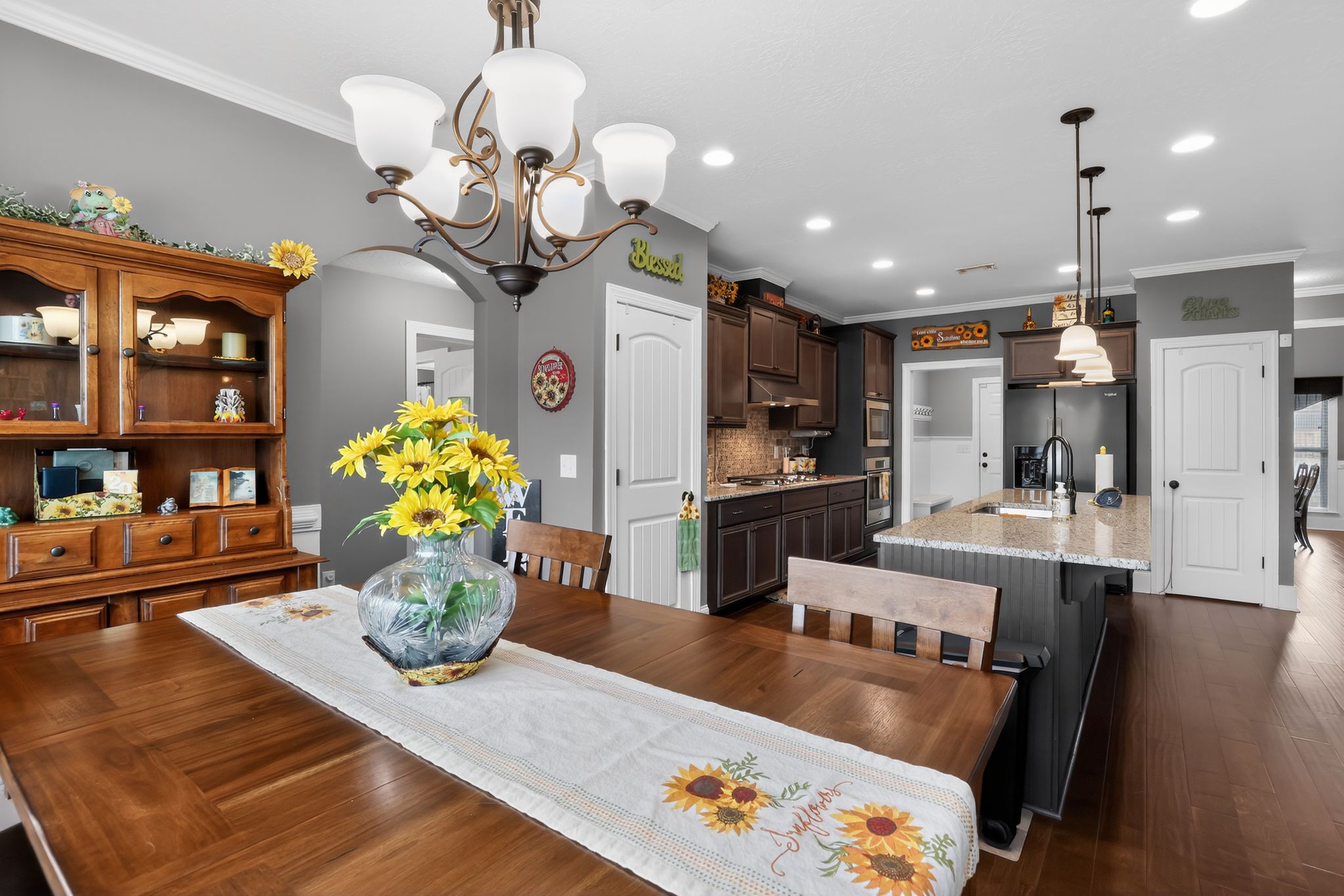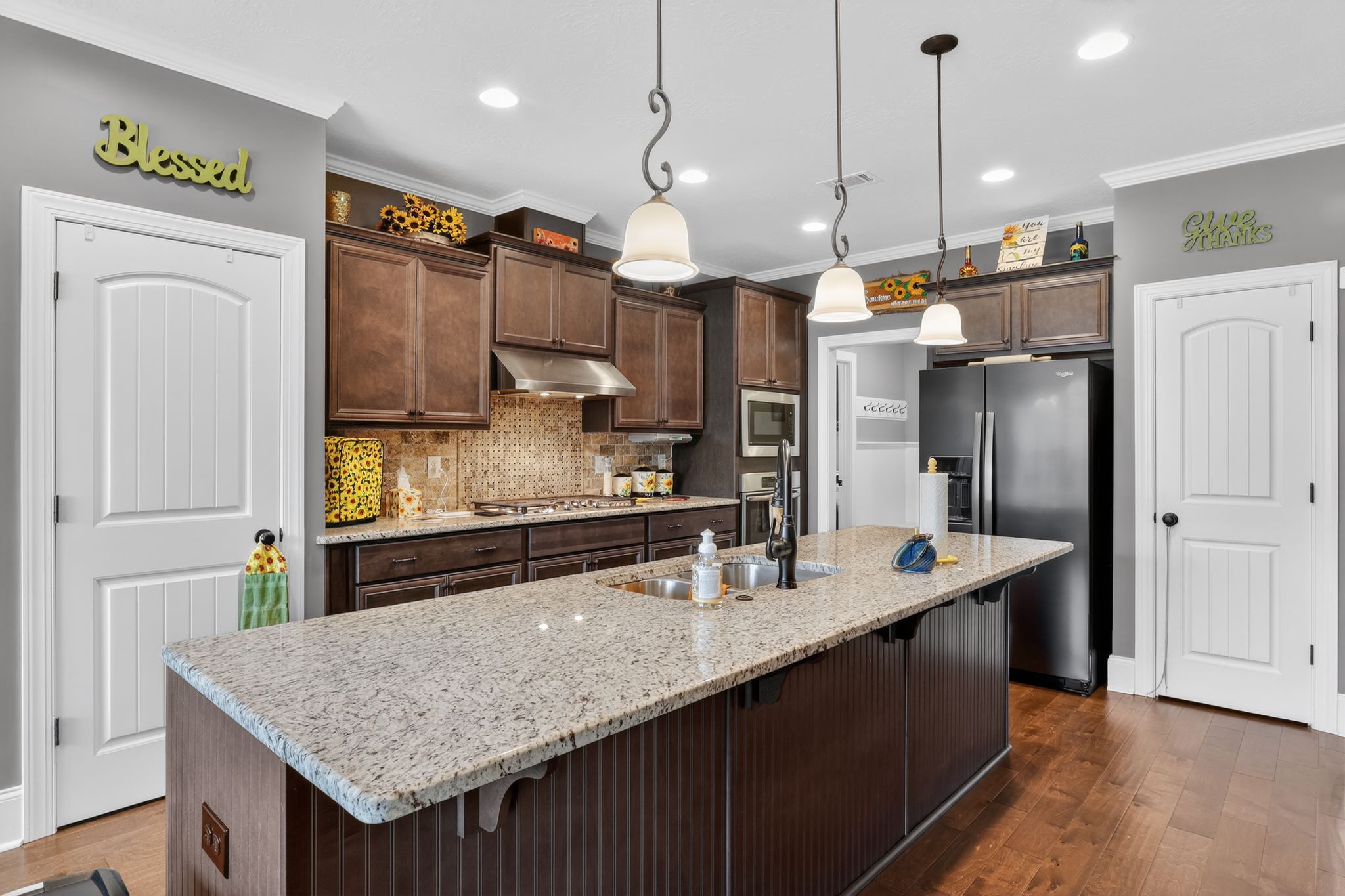 The gourmet kitchen is a standout, complete with stainless steel appliances, granite countertops, gas cooktop, pantry, and a large island with bar seating. Elegant upgrades like crown molding, custom lighting, and upgraded interior doors add a refined touch throughout.