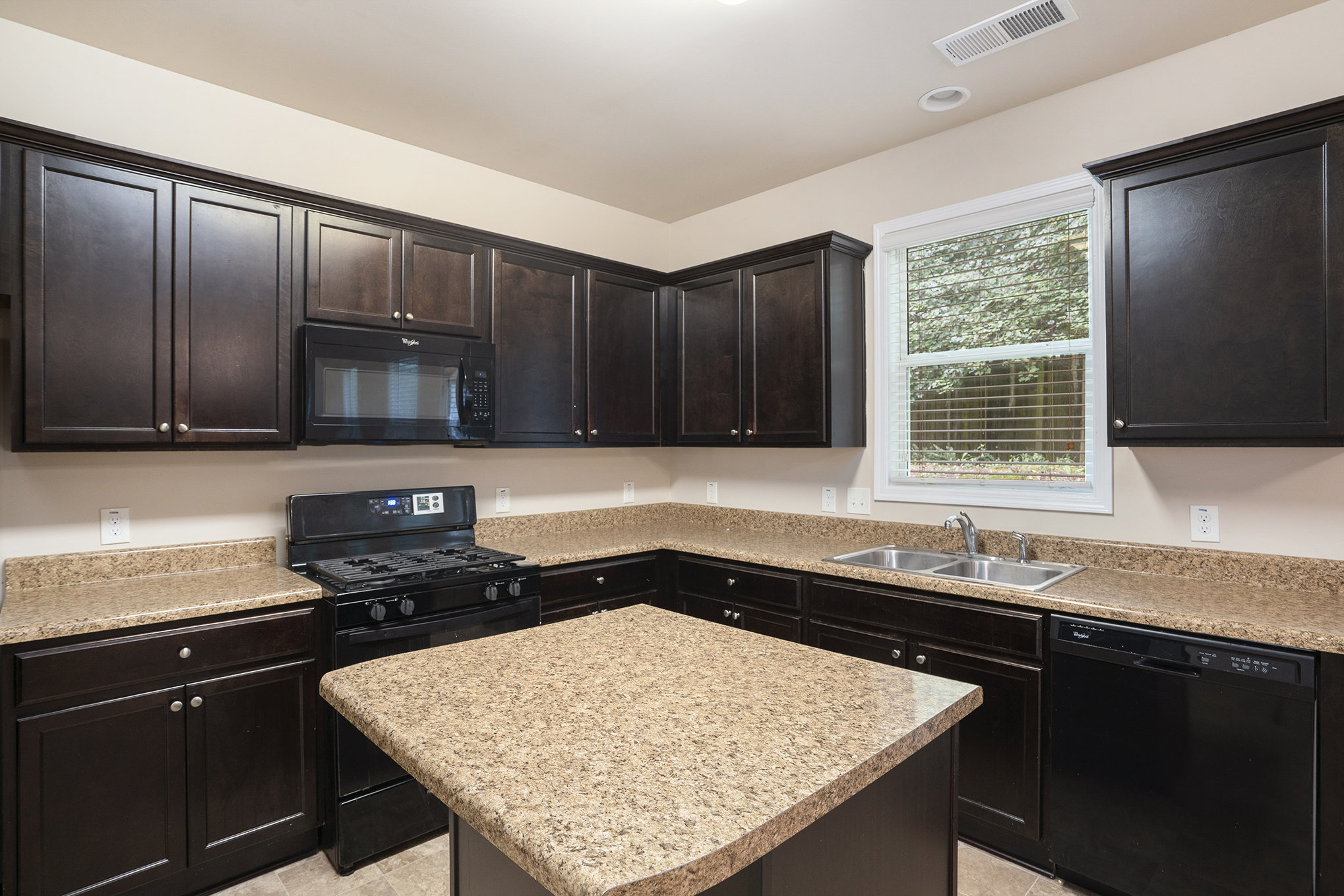 The well-appointed kitchen comes fully equipped with all appliances, offering ample cabinet space, a central prep island, and casual bar seating—ideal for cooking, meal prep, and entertaining.