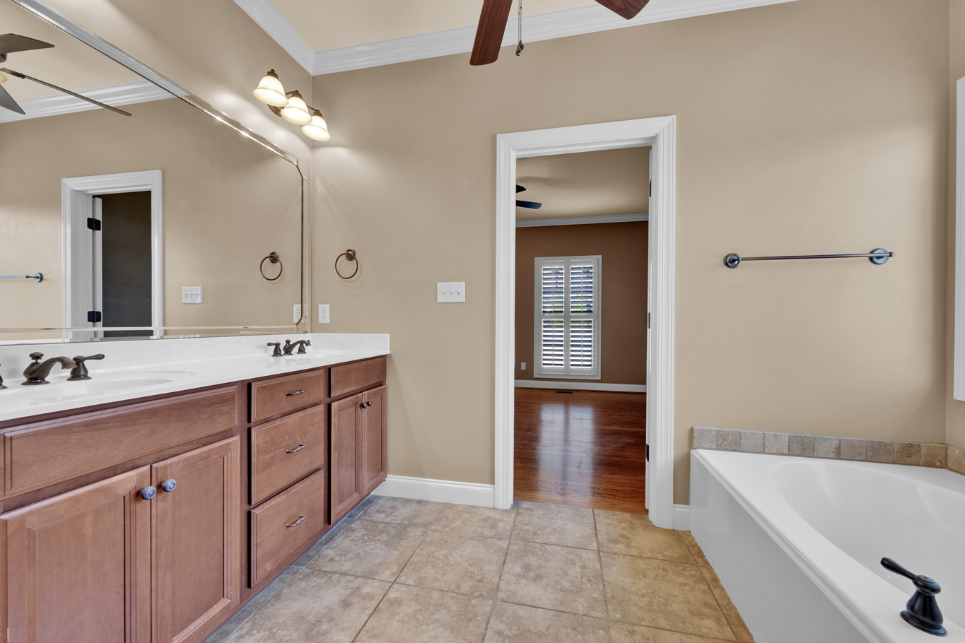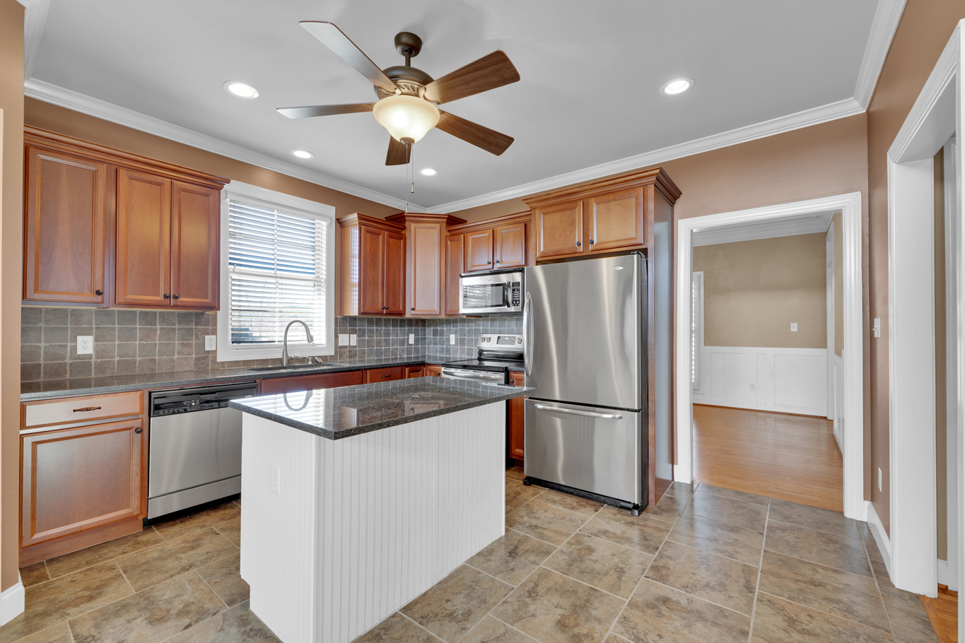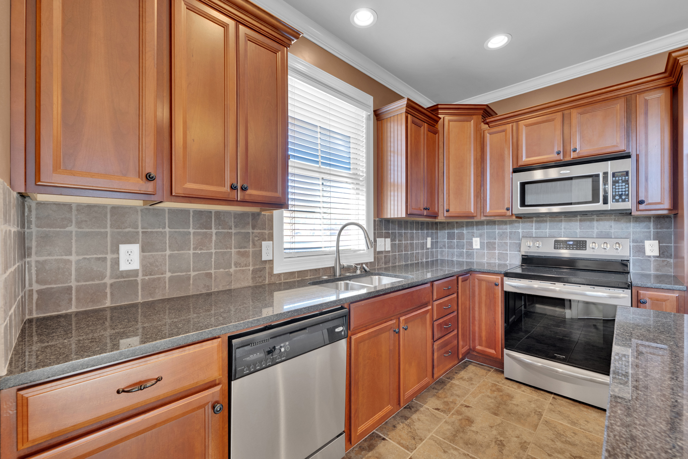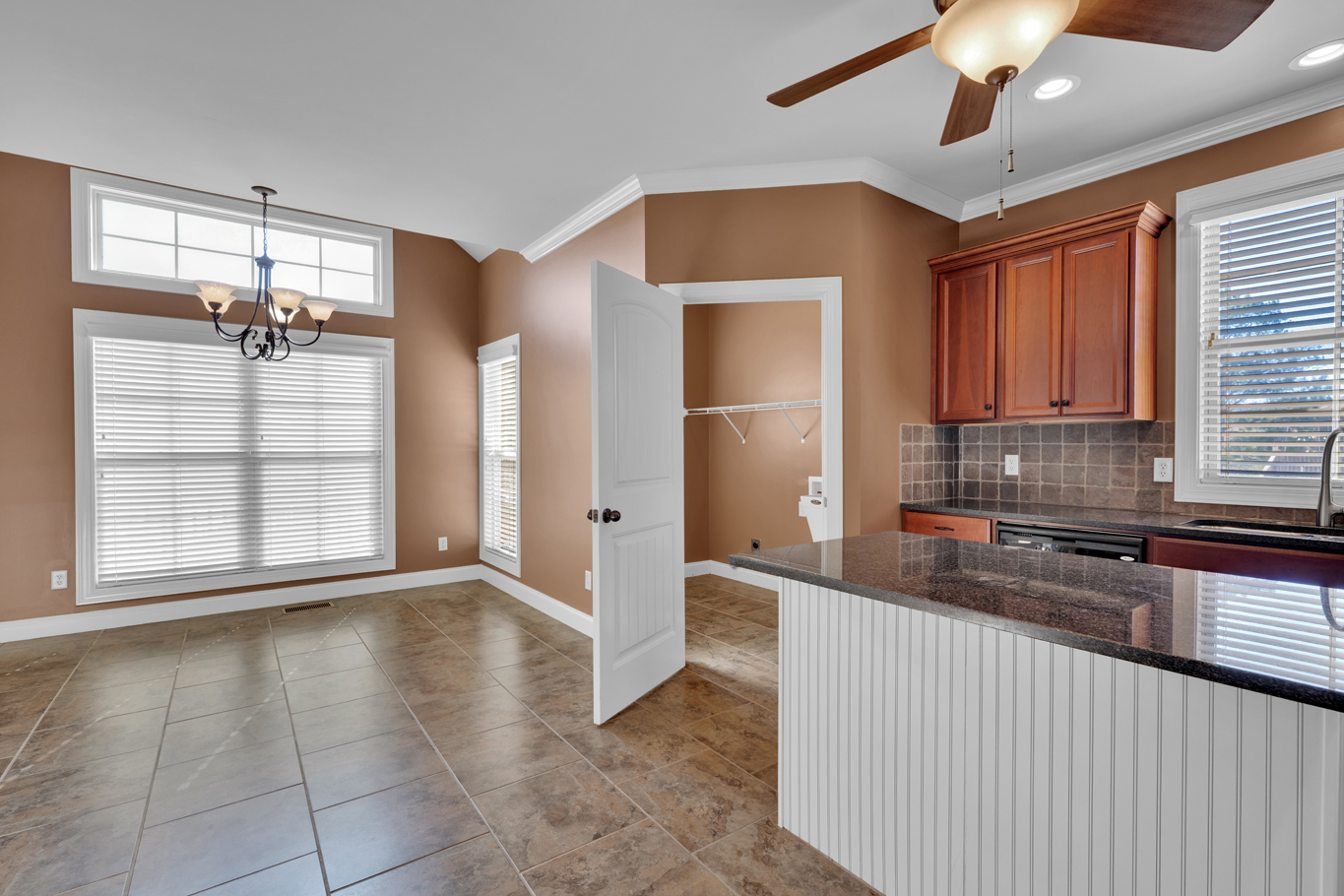 The eat-in kitchen is designed for both form and function, showcasing granite countertops, stainless steel appliances, and ample cabinetry with space for casual dining. The main-level primary suite provides exceptional convenience and privacy, complete with a walk-in closet and a spa-like en-suite bath featuring dual vanities, a jetted soaking tub, and a walk-in shower.