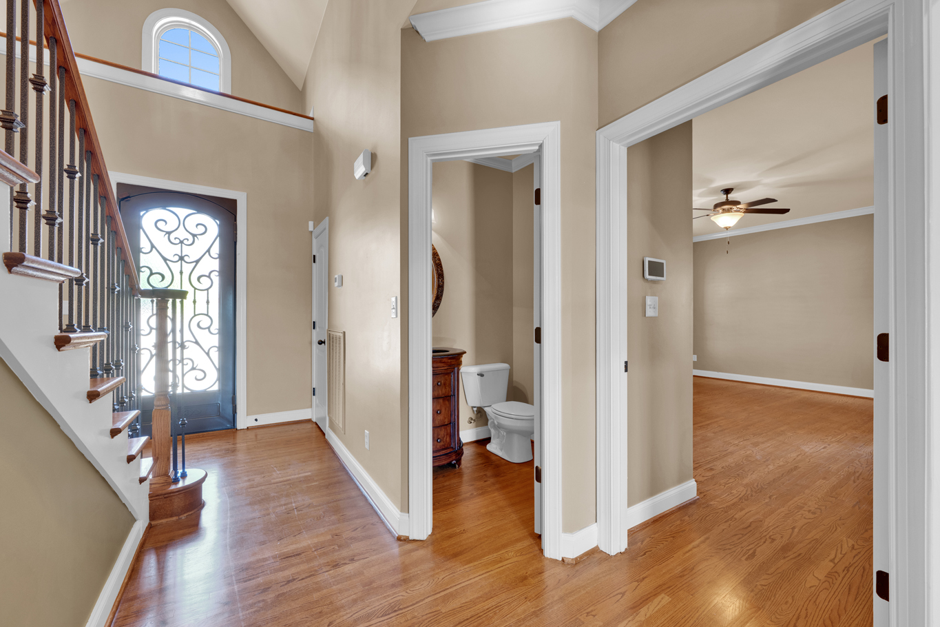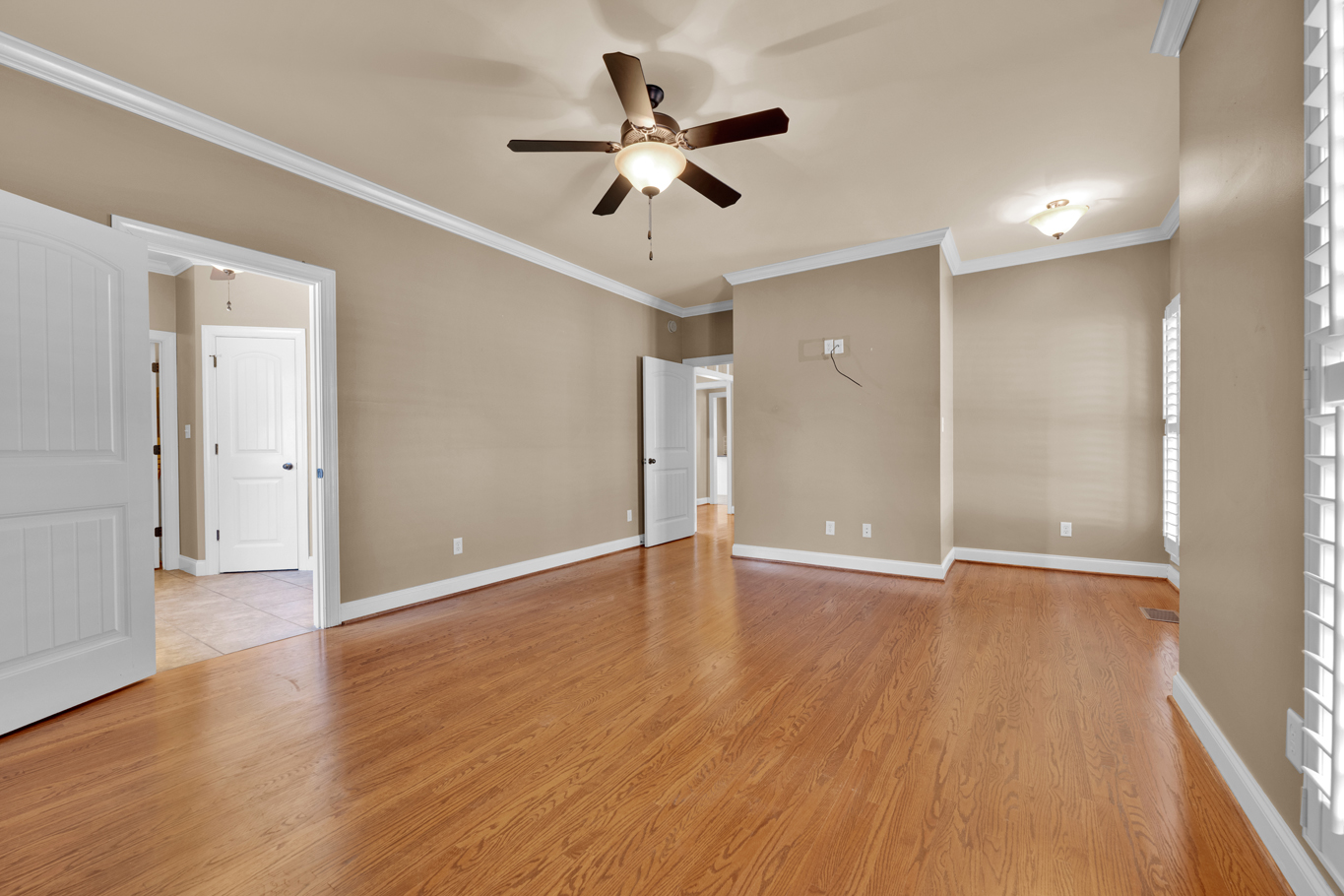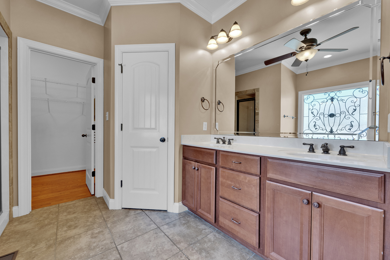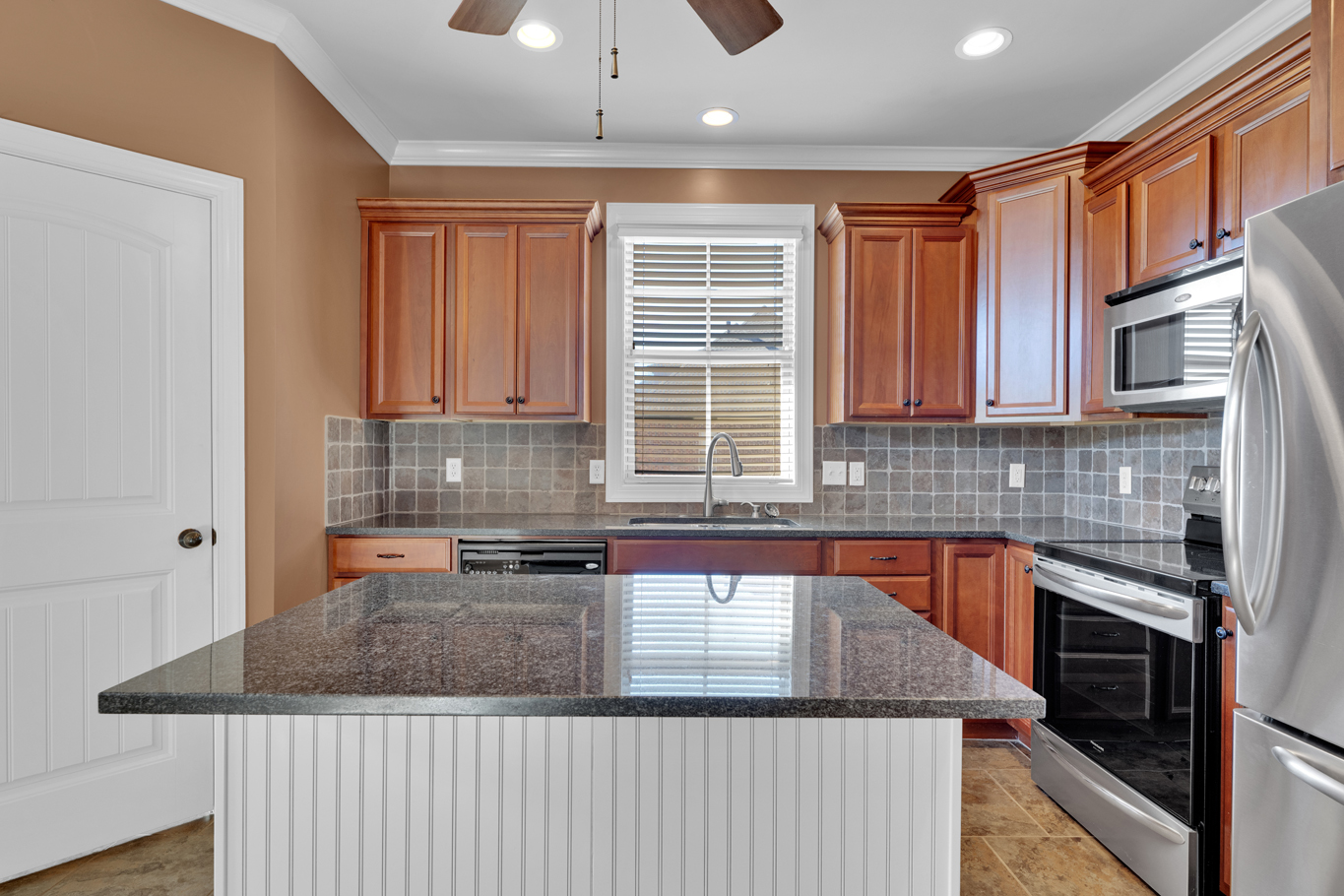 The eat-in kitchen is designed for both form and function, showcasing granite countertops, stainless steel appliances, and ample cabinetry with space for casual dining. The main-level primary suite provides exceptional convenience and privacy, complete with a walk-in closet and a spa-like en-suite bath featuring dual vanities, a jetted soaking tub, and a walk-in shower.