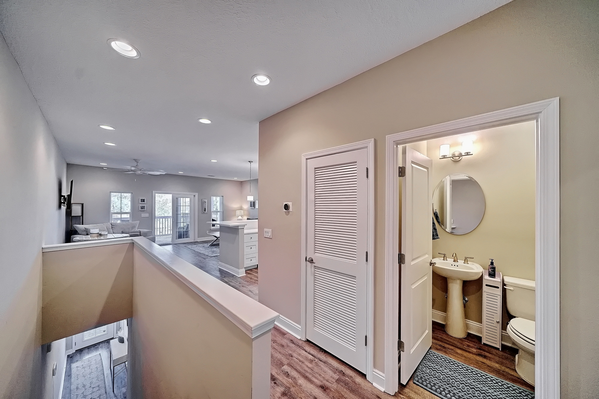 • Open-concept upstairs living area with abundant natural light