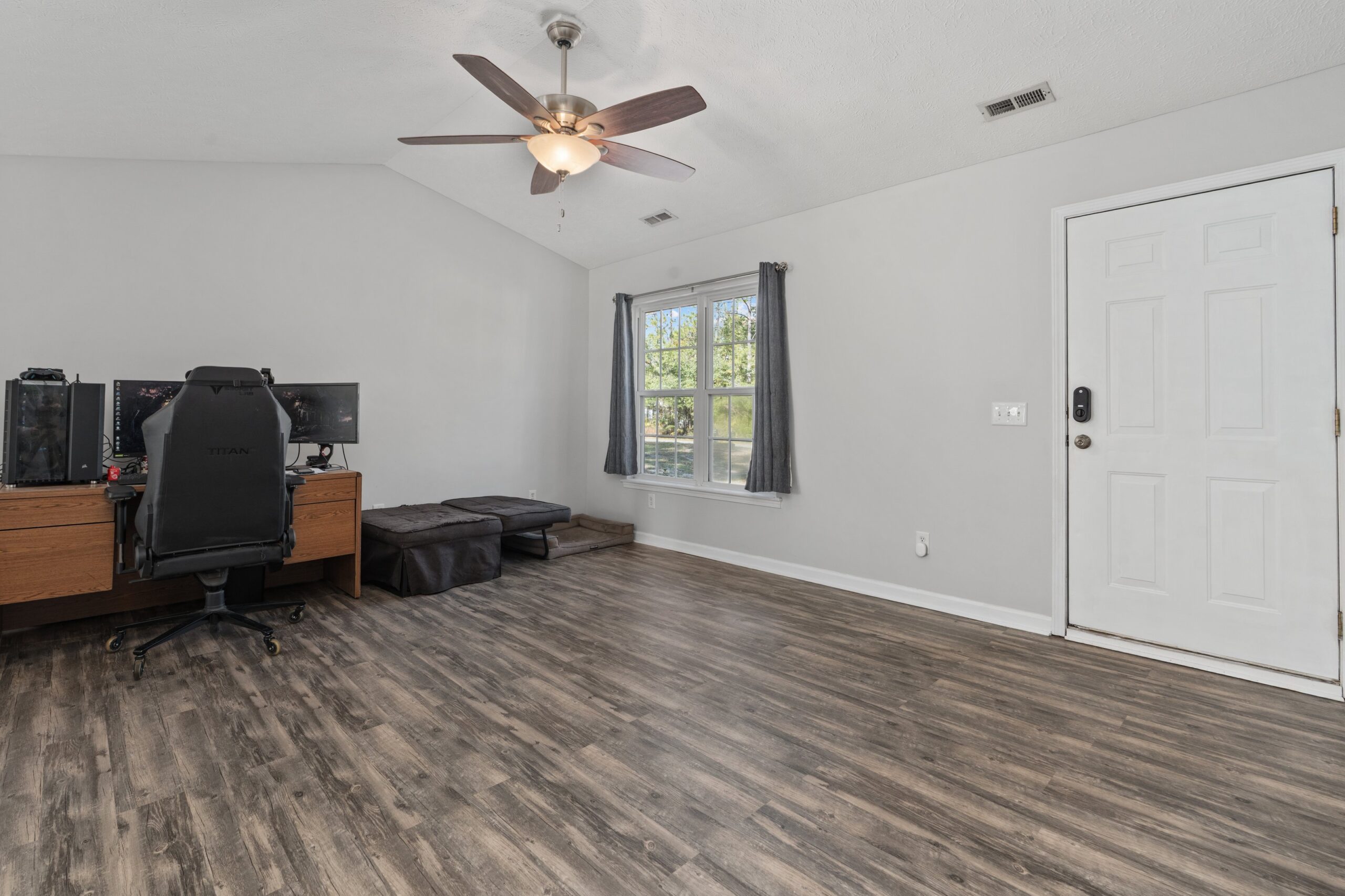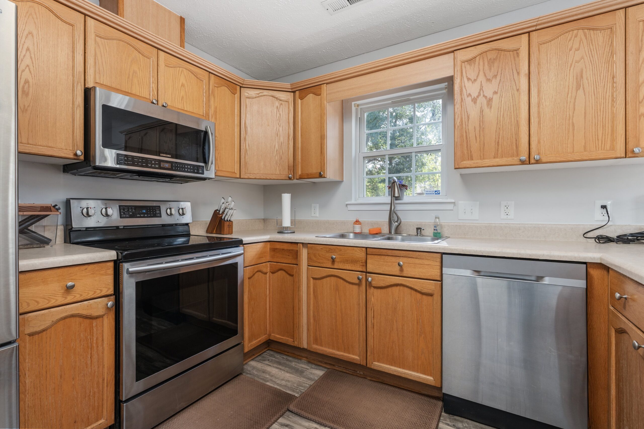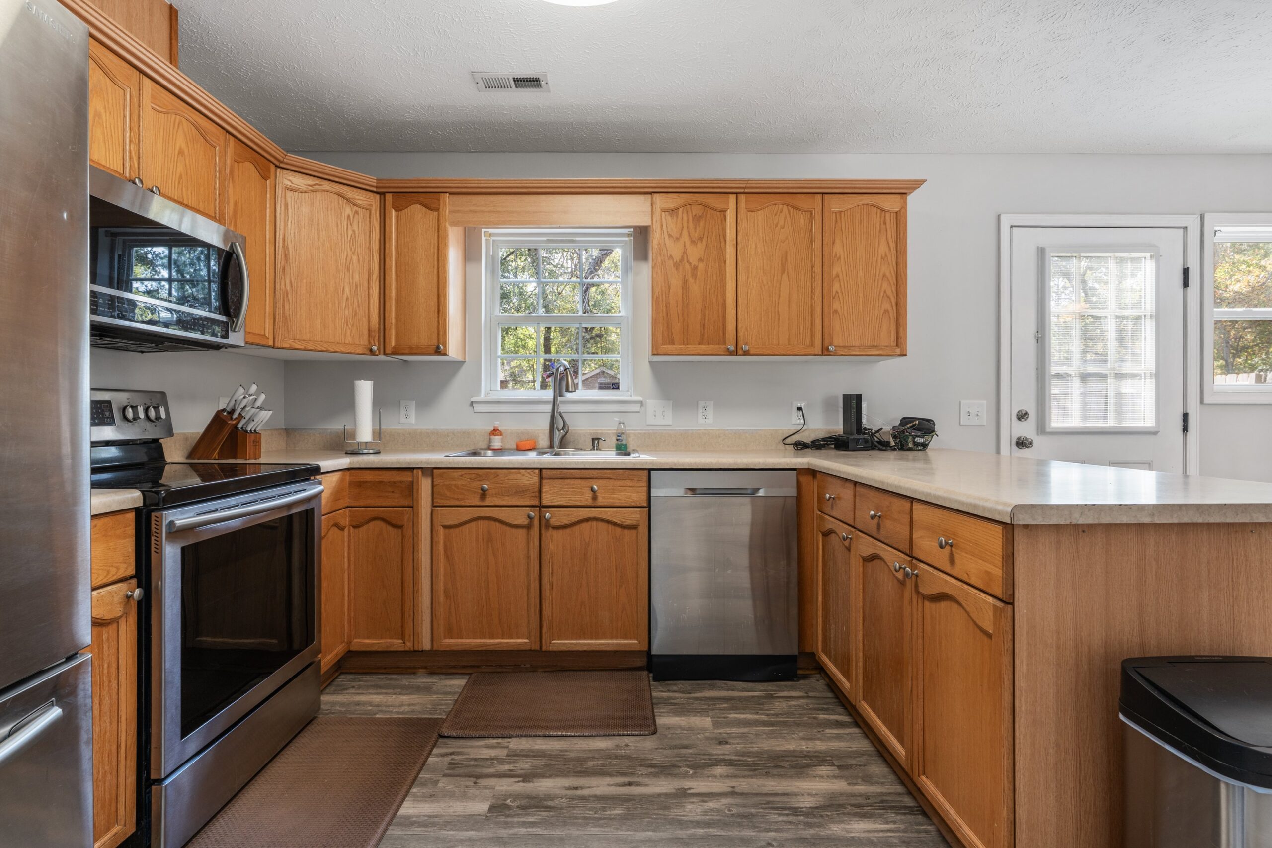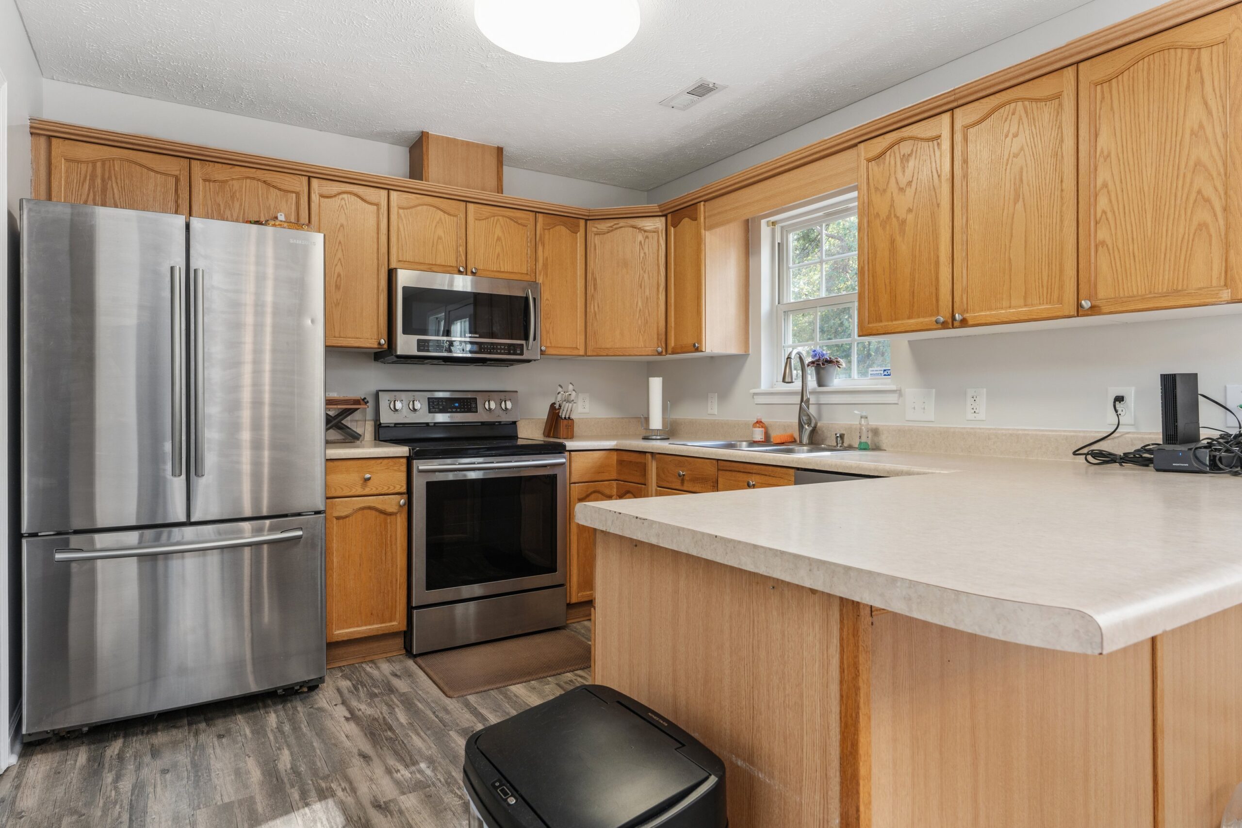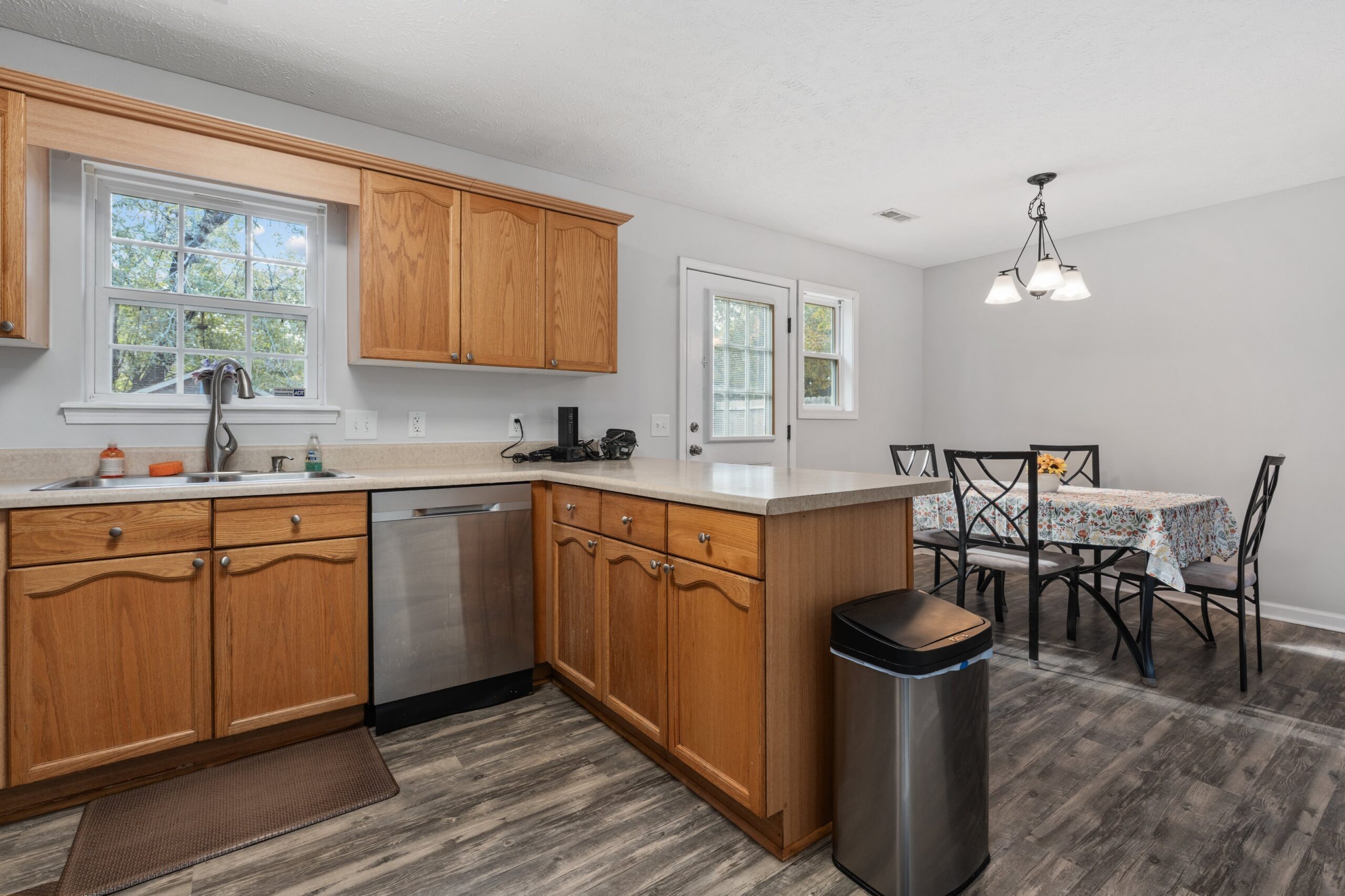 Step into the spacious living room featuring vaulted ceilings and easy-care LVP flooring, creating a bright, airy feel perfect for relaxing or entertaining. The updated kitchen is designed for everyday ease with stainless steel appliances, generous cabinet storage, and a wraparound breakfast bar that seamlessly connects to the dining area — ideal for hosting family dinners or casual get-togethers.