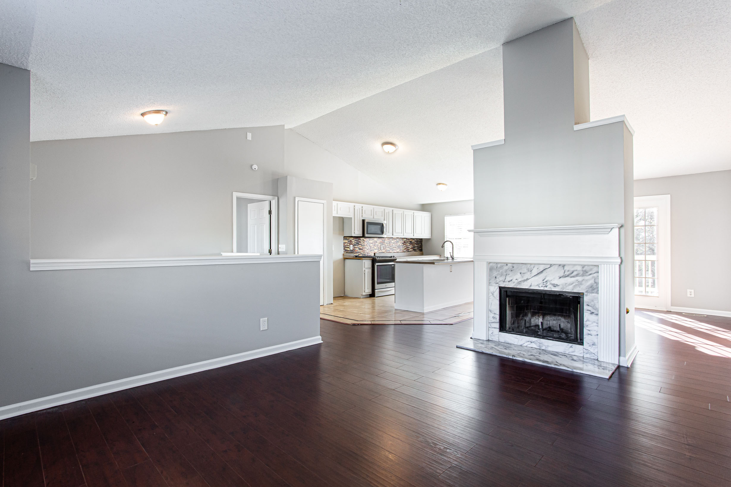 Bright, Open-Concept Living: Large living and dining areas centered around a cozy central fireplace, perfect for entertaining.