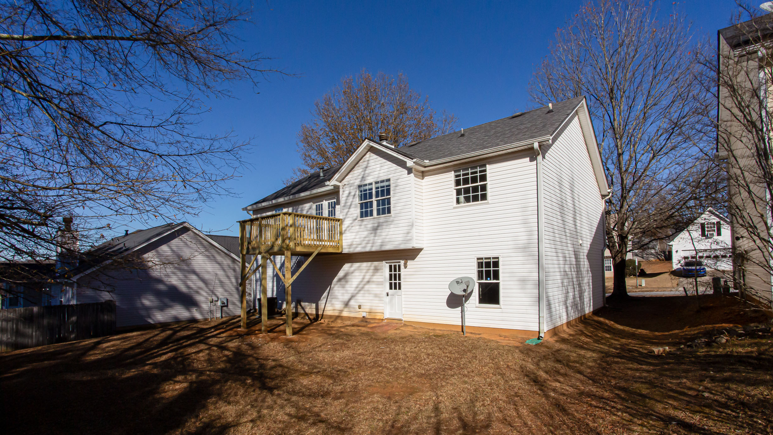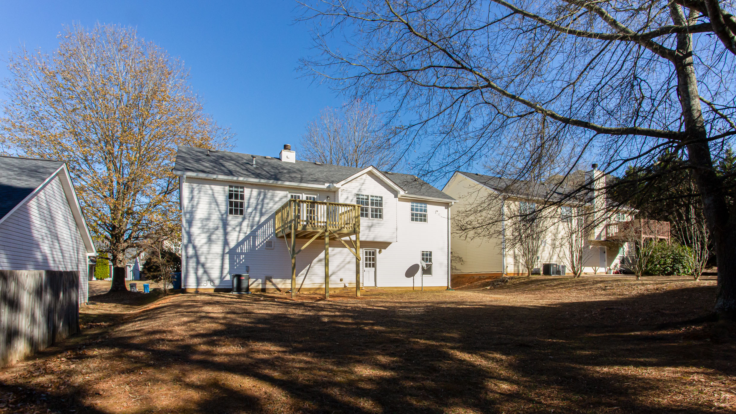 Outdoor Living: Brand-new 10×10 deck overlooking a deep backyard with mature trees, offering privacy and scenic views.