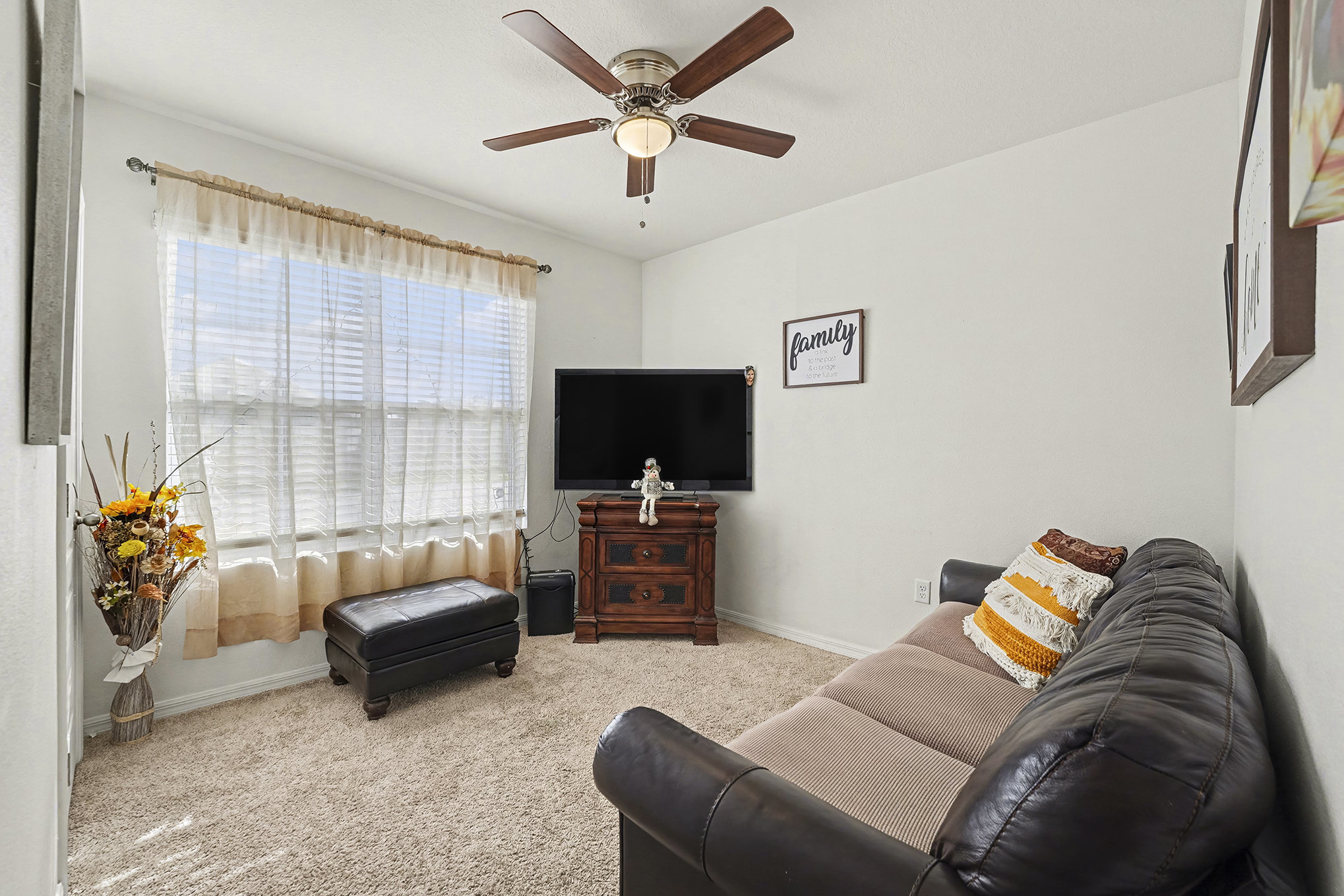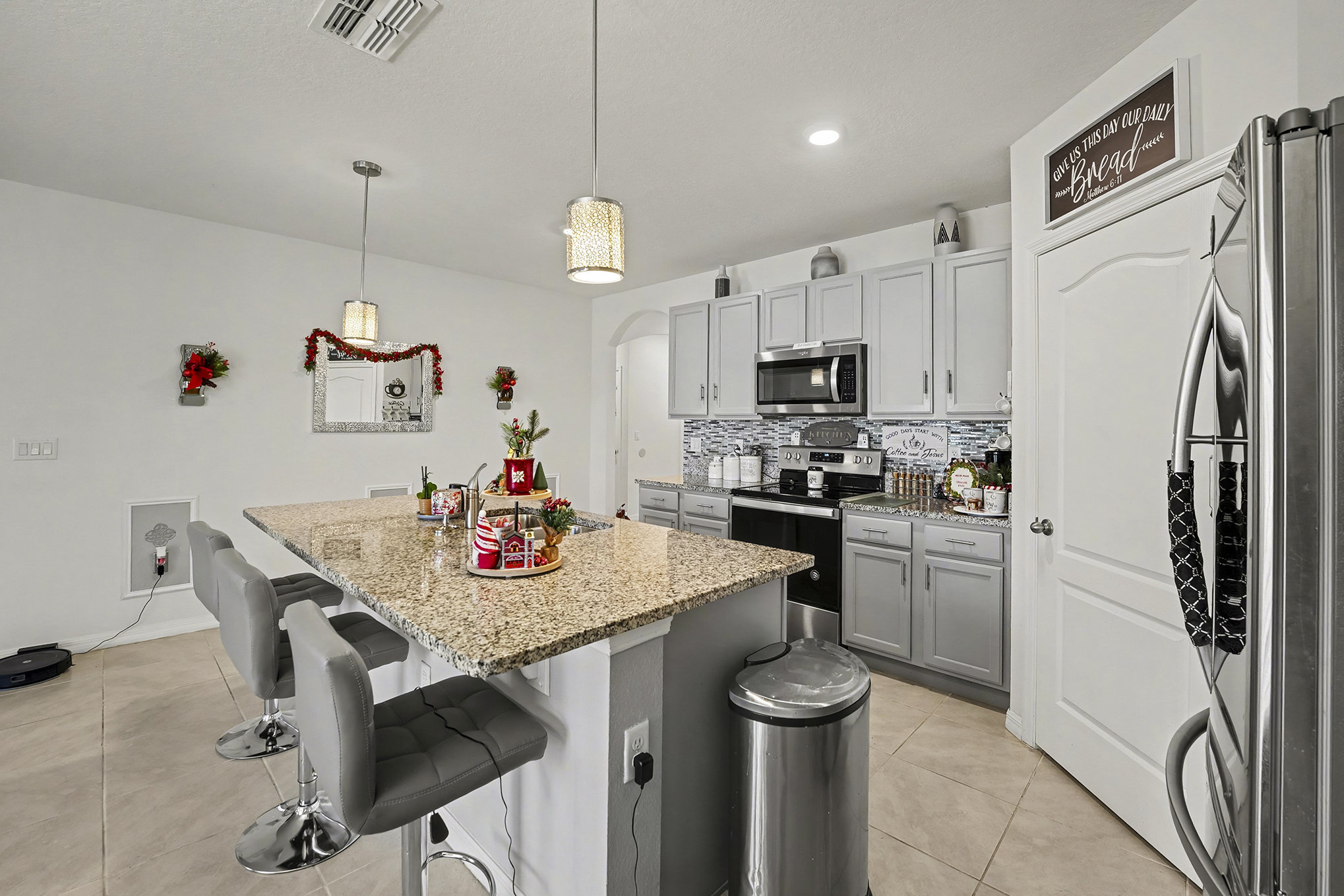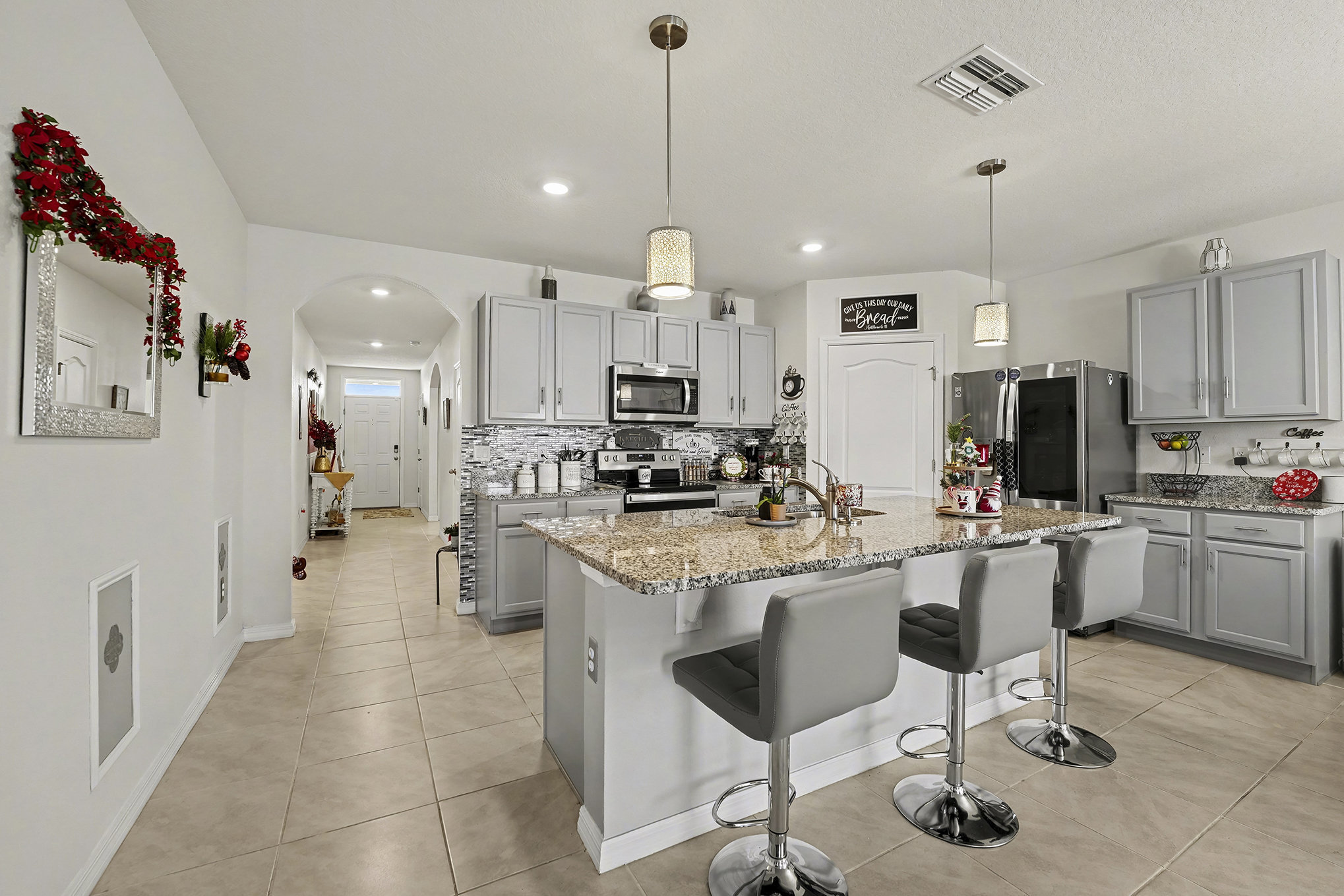 Designed for both entertaining and daily living, the open-concept floor plan features neutral finishes and updated light fixtures that create a bright, warm, and welcoming atmosphere. The modern kitchen is a standout, showcasing a large island with breakfast bar, stylish pendant lighting, stainless steel appliances, a spacious corner pantry, upgraded countertops, and sleek gray cabinetry—perfect for home chefs and gatherings alike.