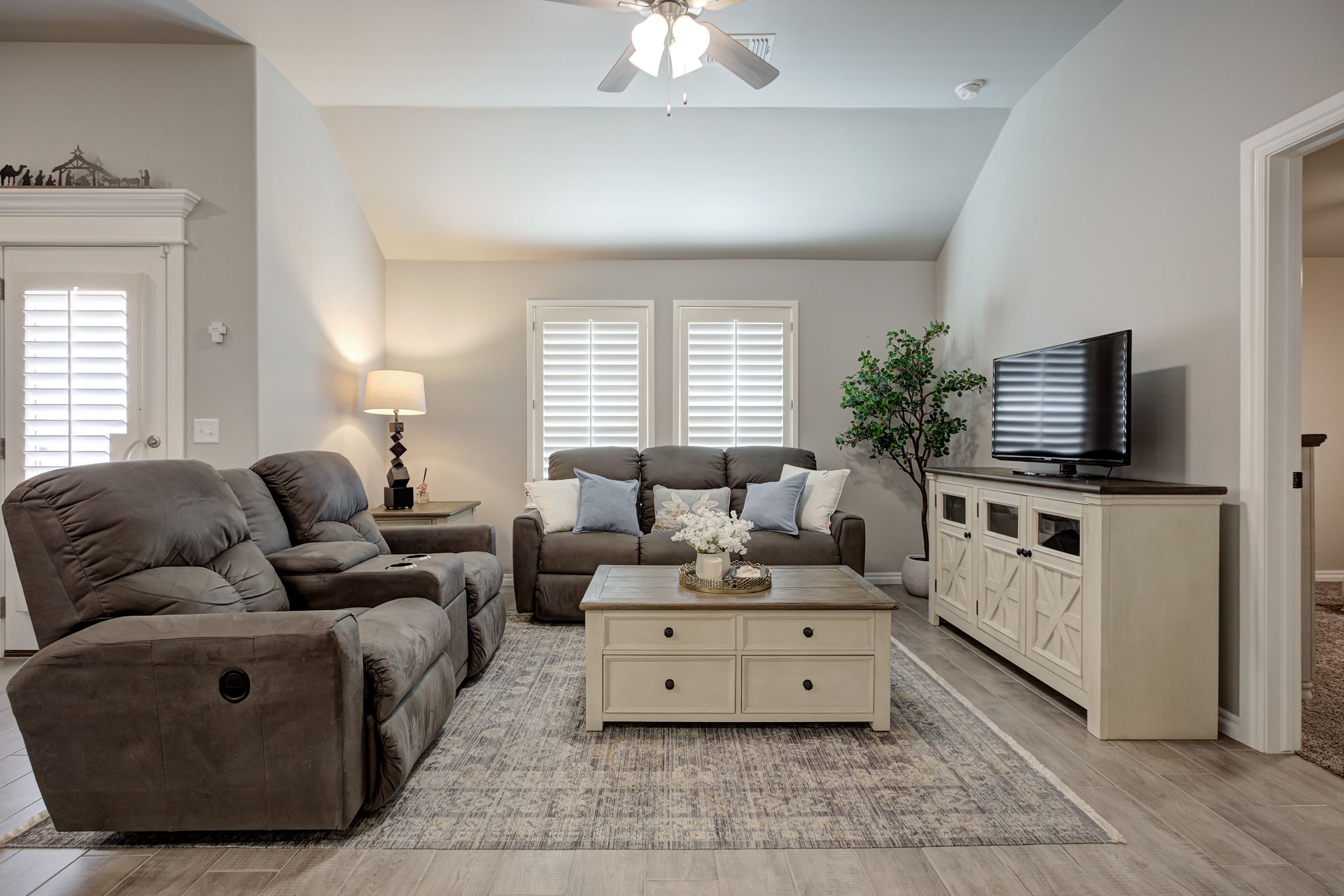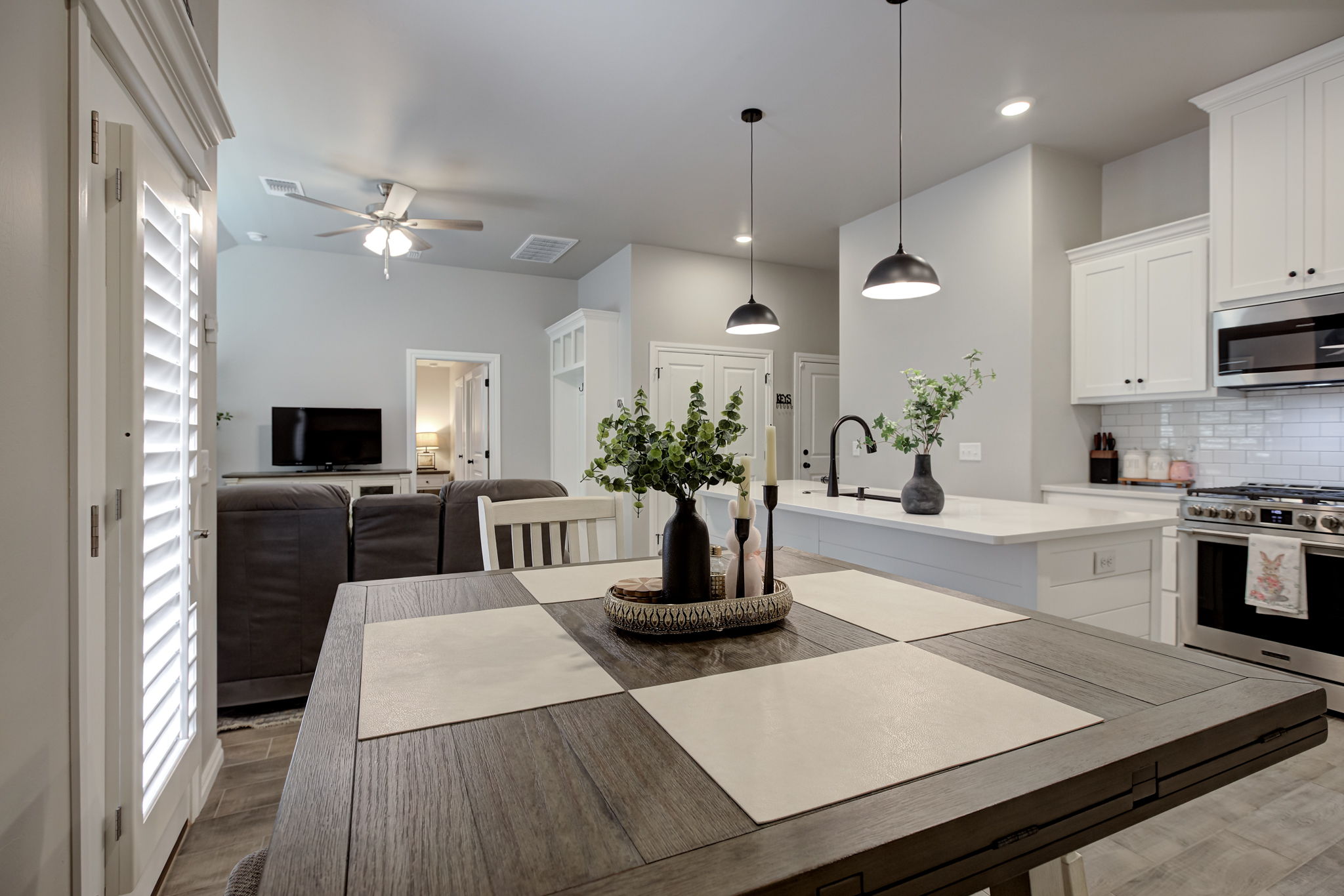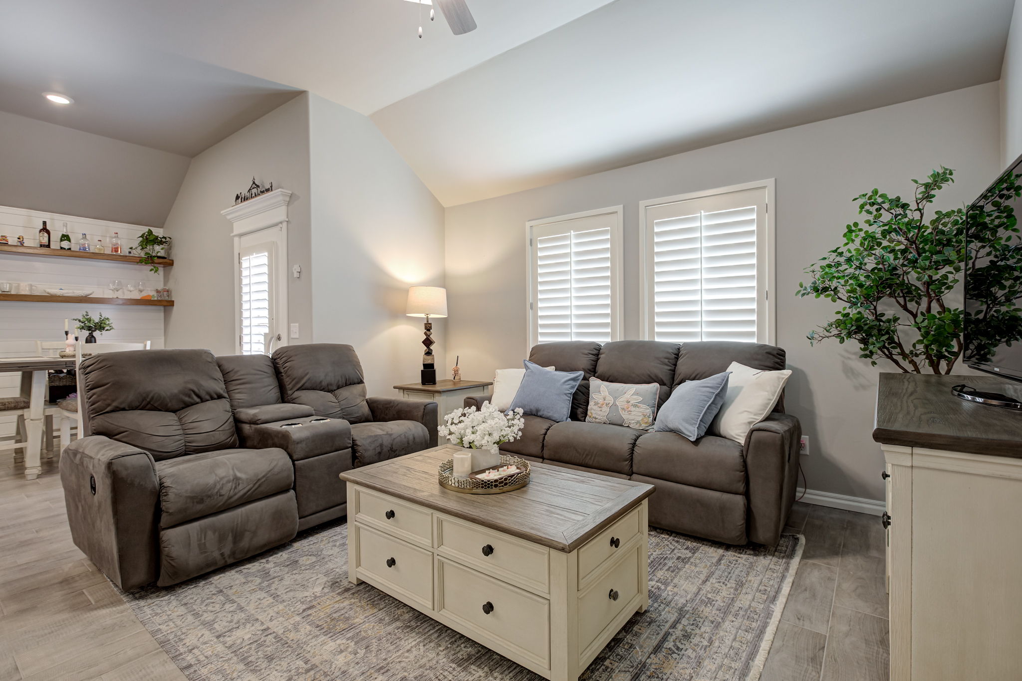Additional features include custom plantation shutters throughout, delivering timeless elegance, natural light control, and added privacy.