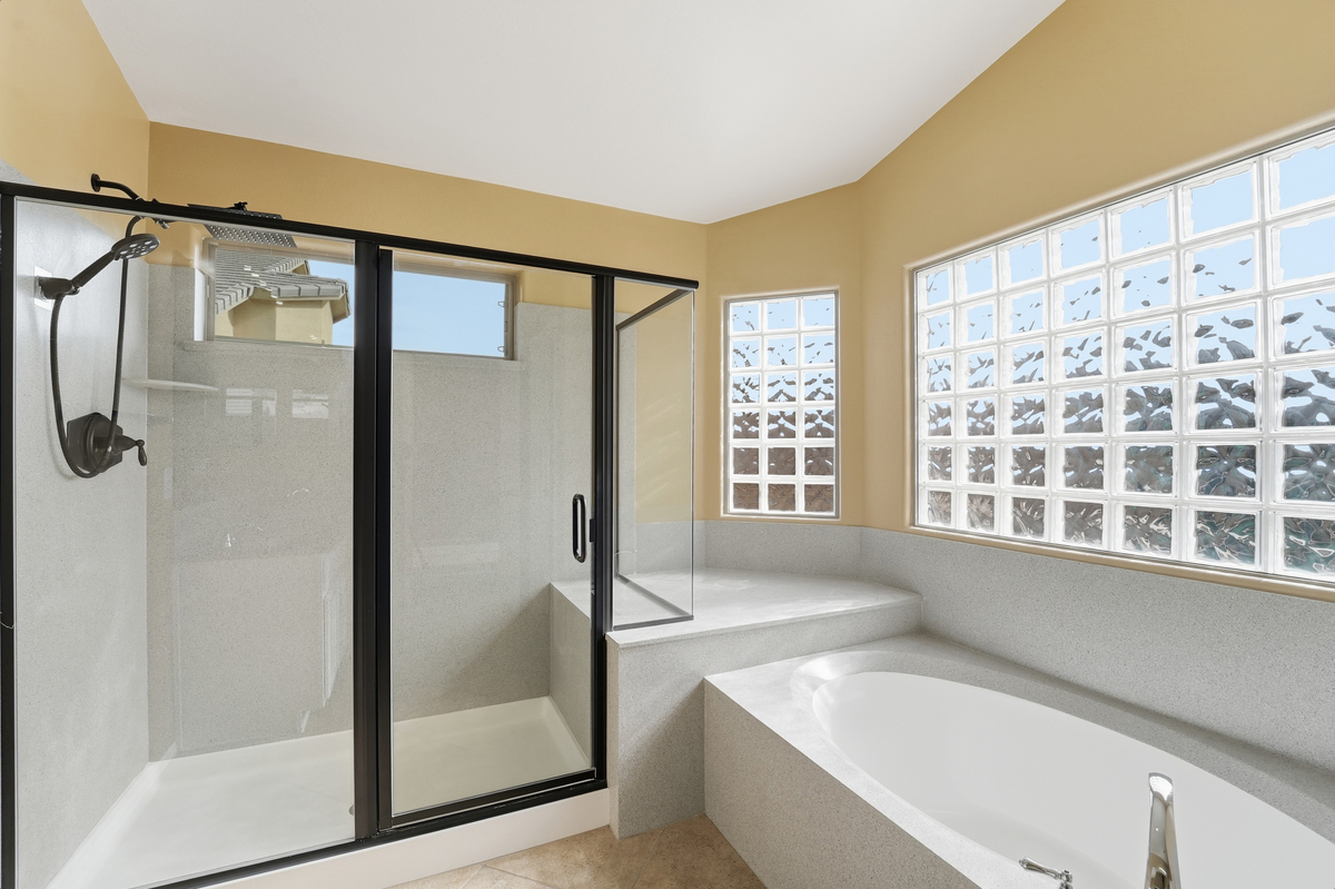 Retreat to the private primary suite, featuring a walk-in closet and a luxurious en-suite bath with dual sinks, a relaxing garden tub, and an oversized walk-in shower.