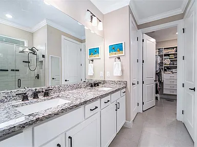 Your primary suite is a calming sanctuary featuring a spa-inspired bath complete with a walk-in shower and built-in bench, dual sinks, a private water closet, and an expansive walk-in closet. The secondary bedroom is ideally placed at the front of the home, offering comfort and privacy for guests.