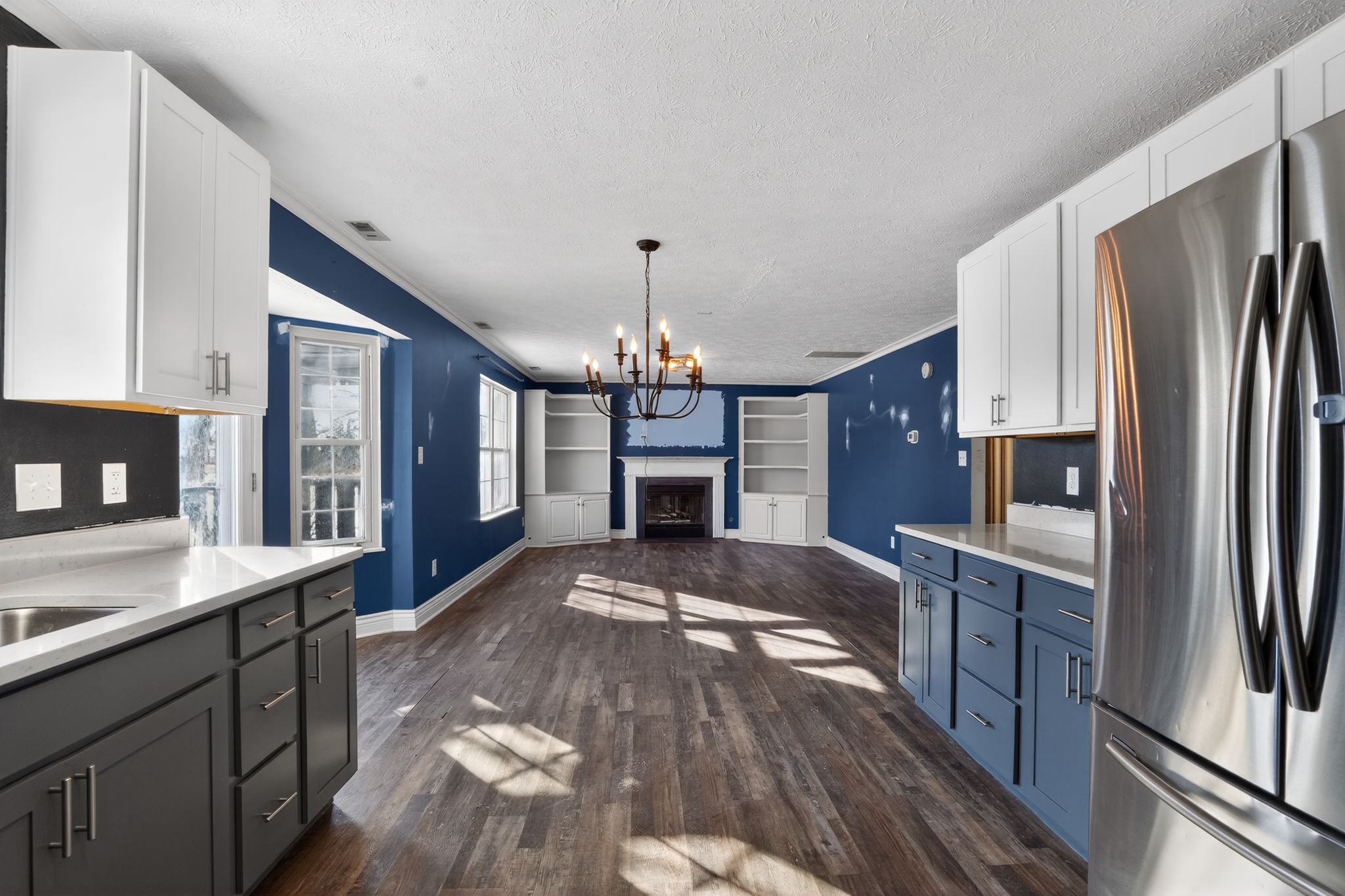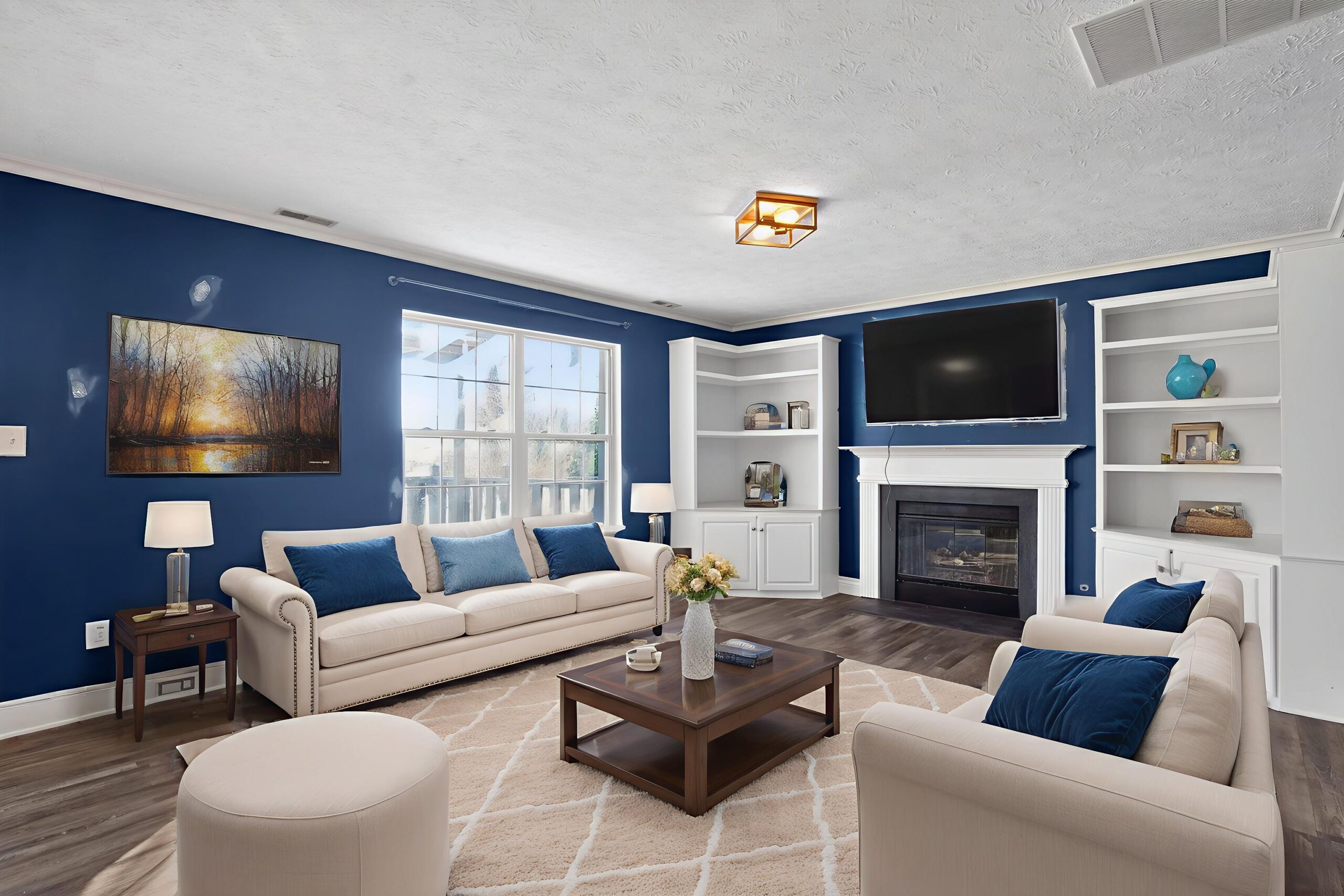 Step inside to an inviting living room centered around a cozy fireplace hearth, flanked by custom built-in shelving that provides both charm and functional storage. The open-concept layout creates seamless transitions between living spaces, making gatherings with family and friends a breeze.