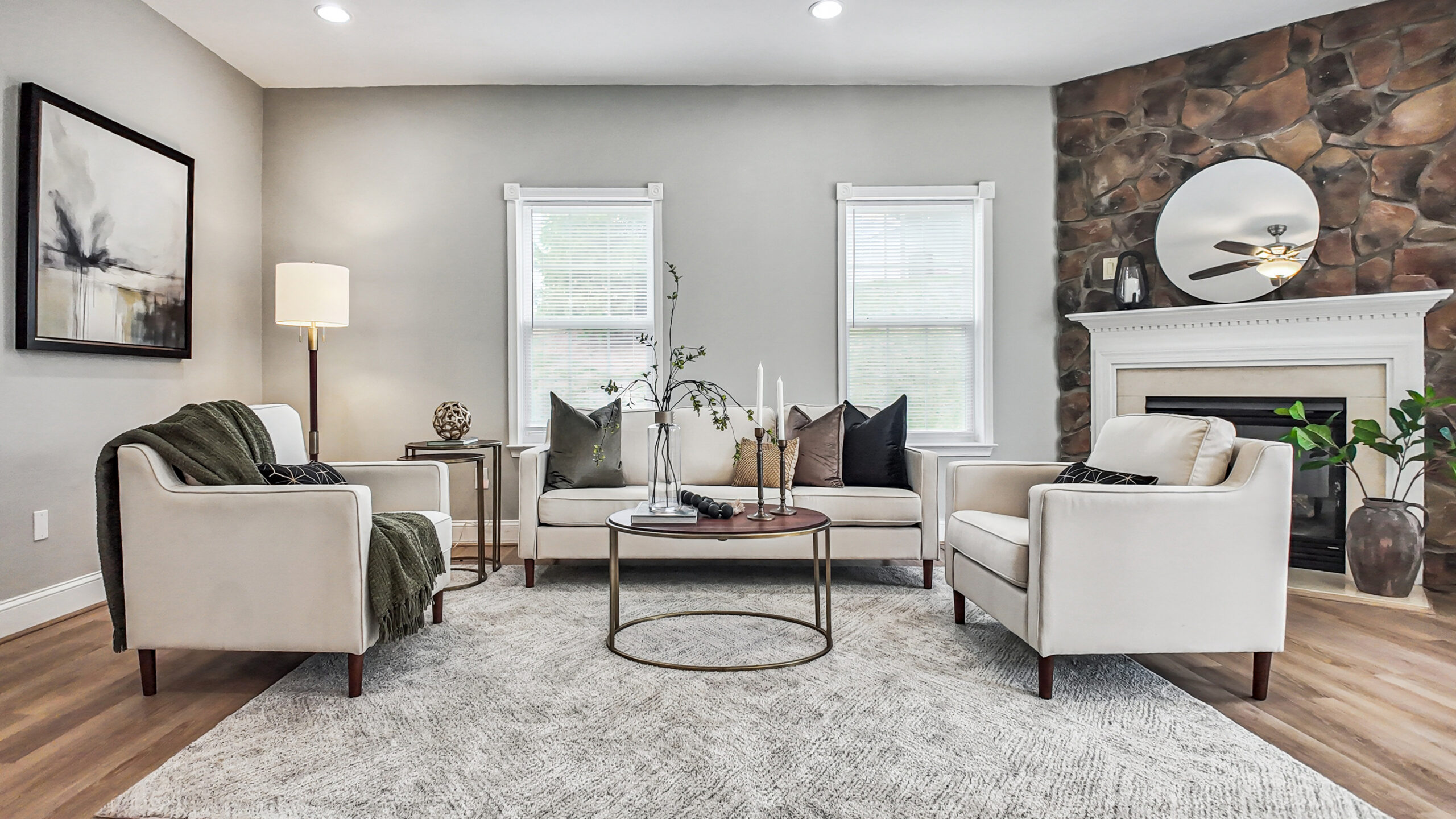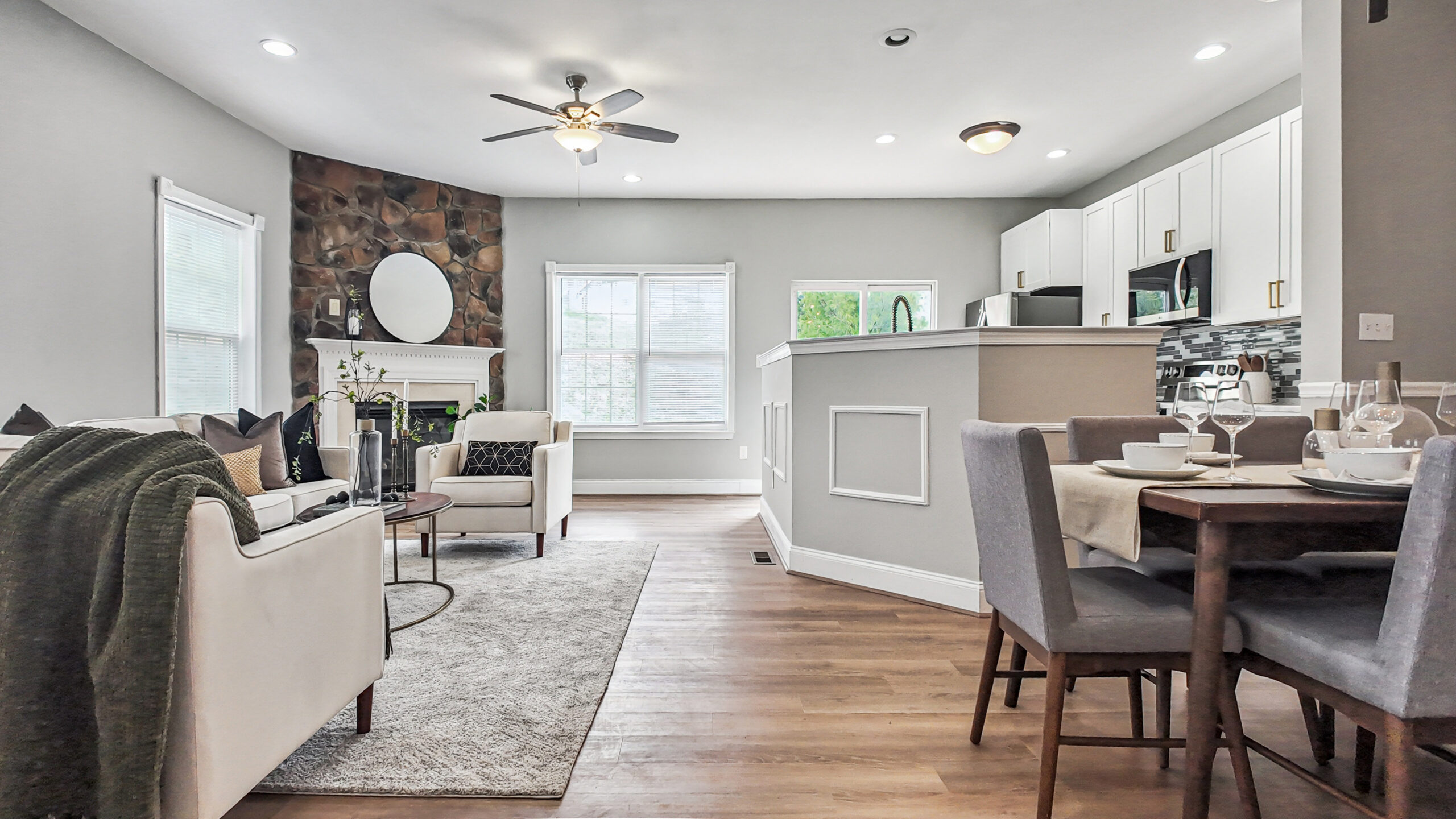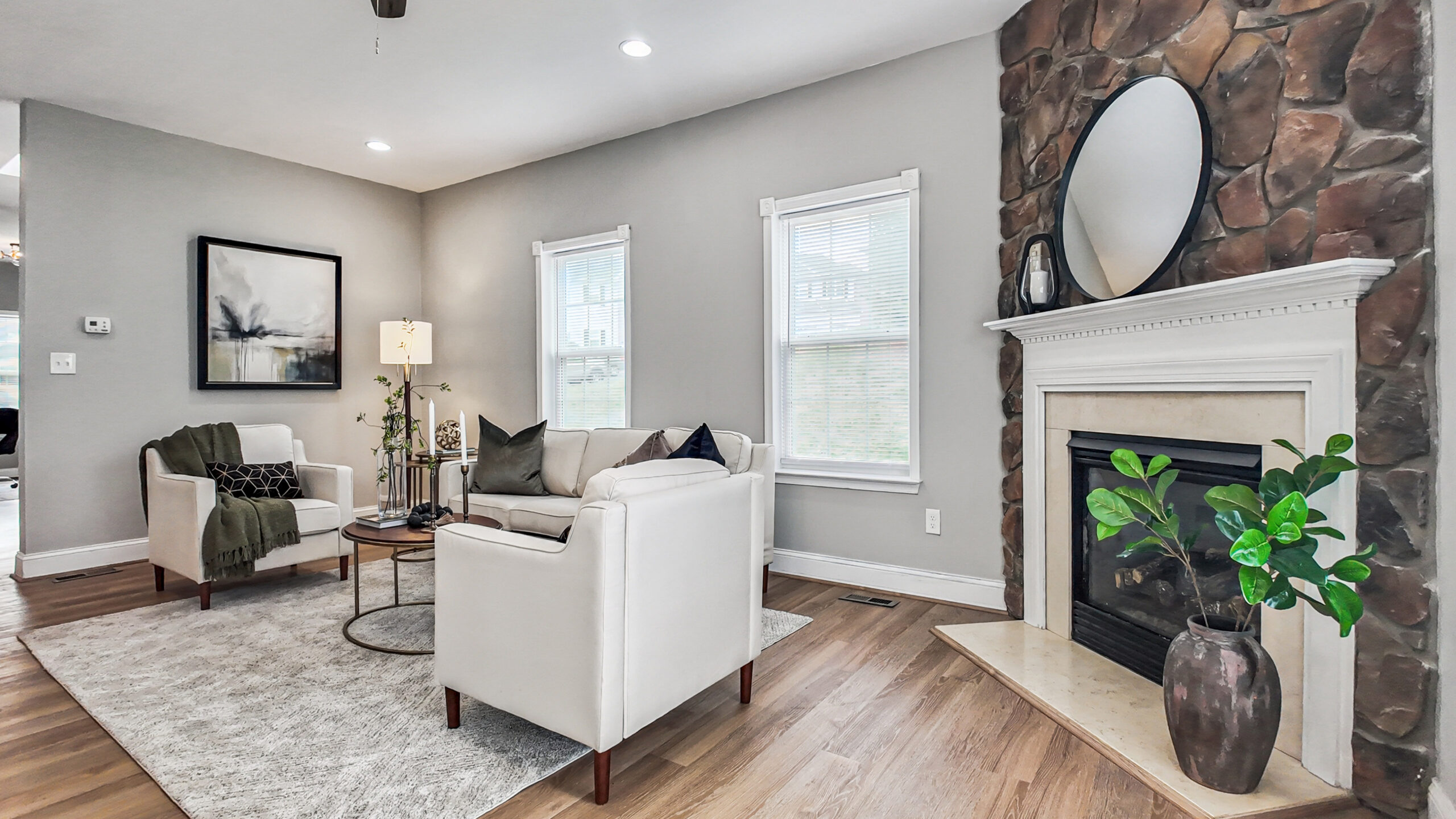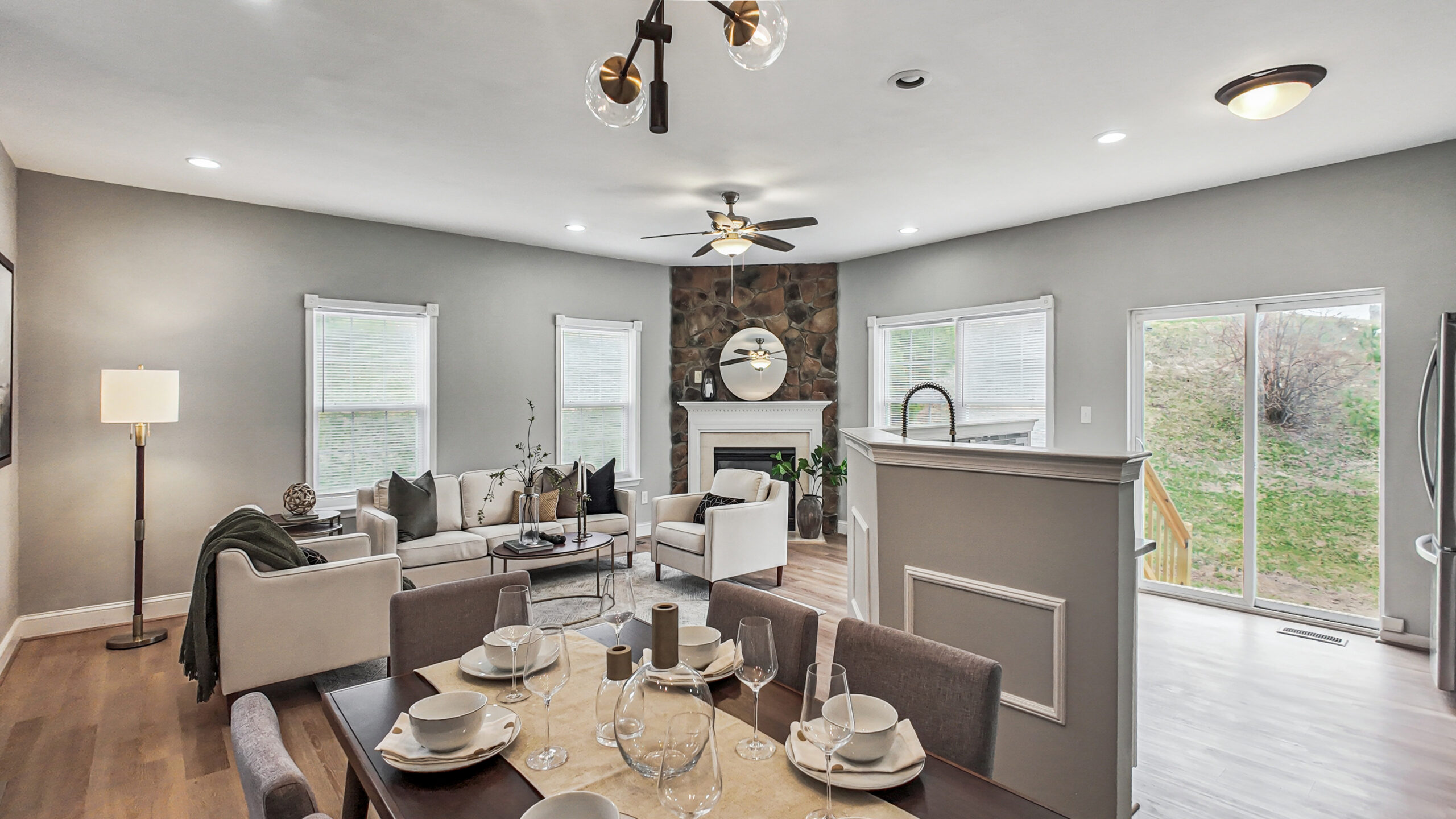 Step inside the impressive two-story foyer that opens to a bright, airy floor plan filled with natural light. Just off the entry, a versatile flex room provides the perfect space for a home office, playroom, or cozy lounge area. The main living space is ideal for everyday living and entertaining, featuring a striking stone fireplace, new recessed lighting, dining area, and walkout access to the backyard for easy indoor-outdoor living.