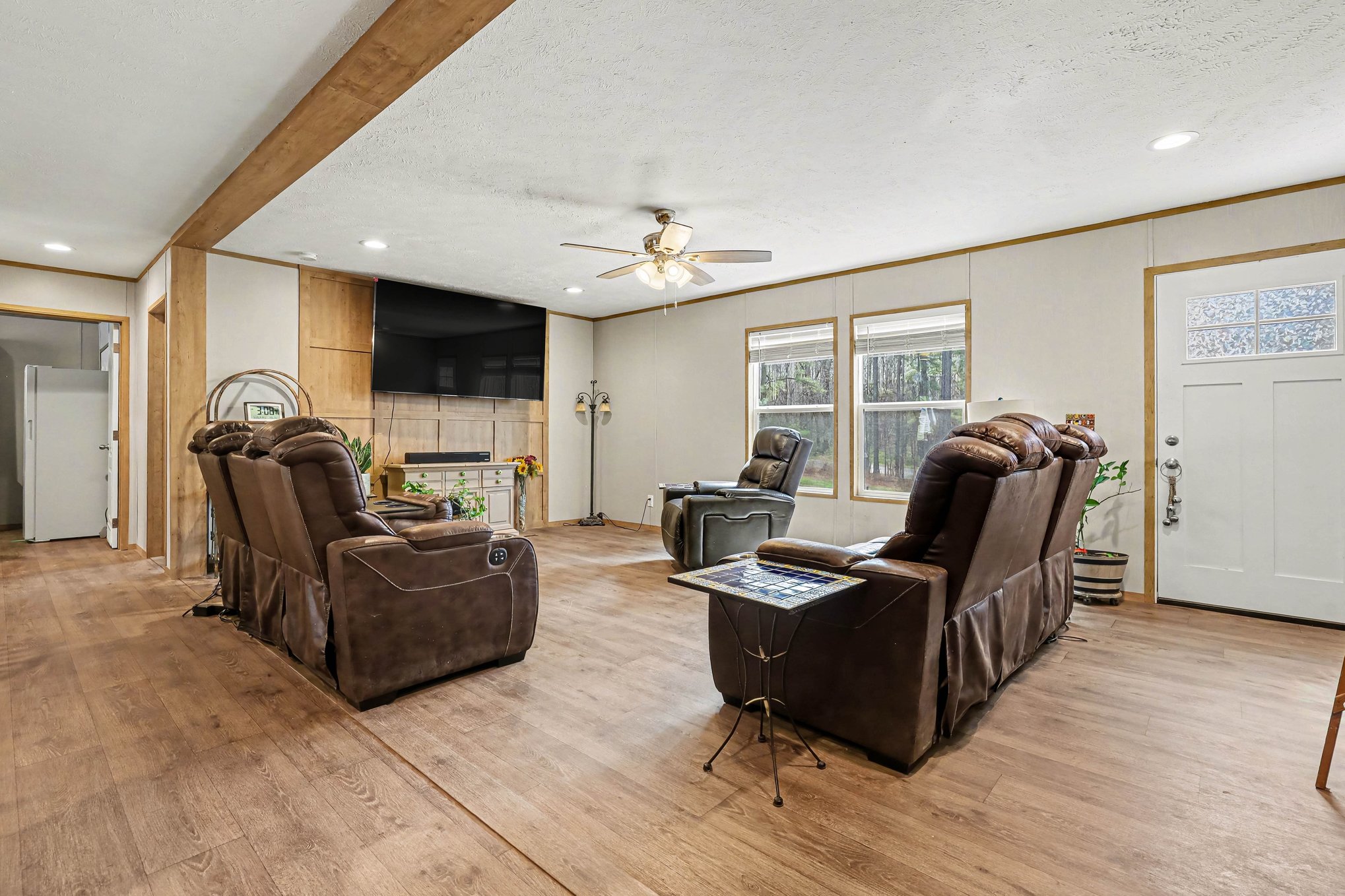 Inside, the open-concept floorplan feels airy and welcoming with stylish LVP flooring, recessed lighting, and abundant natural light throughout. The spacious kitchen is designed for both everyday living and entertaining, complete with stainless steel appliances, an extra-deep sink, and a large center island with bar seating.