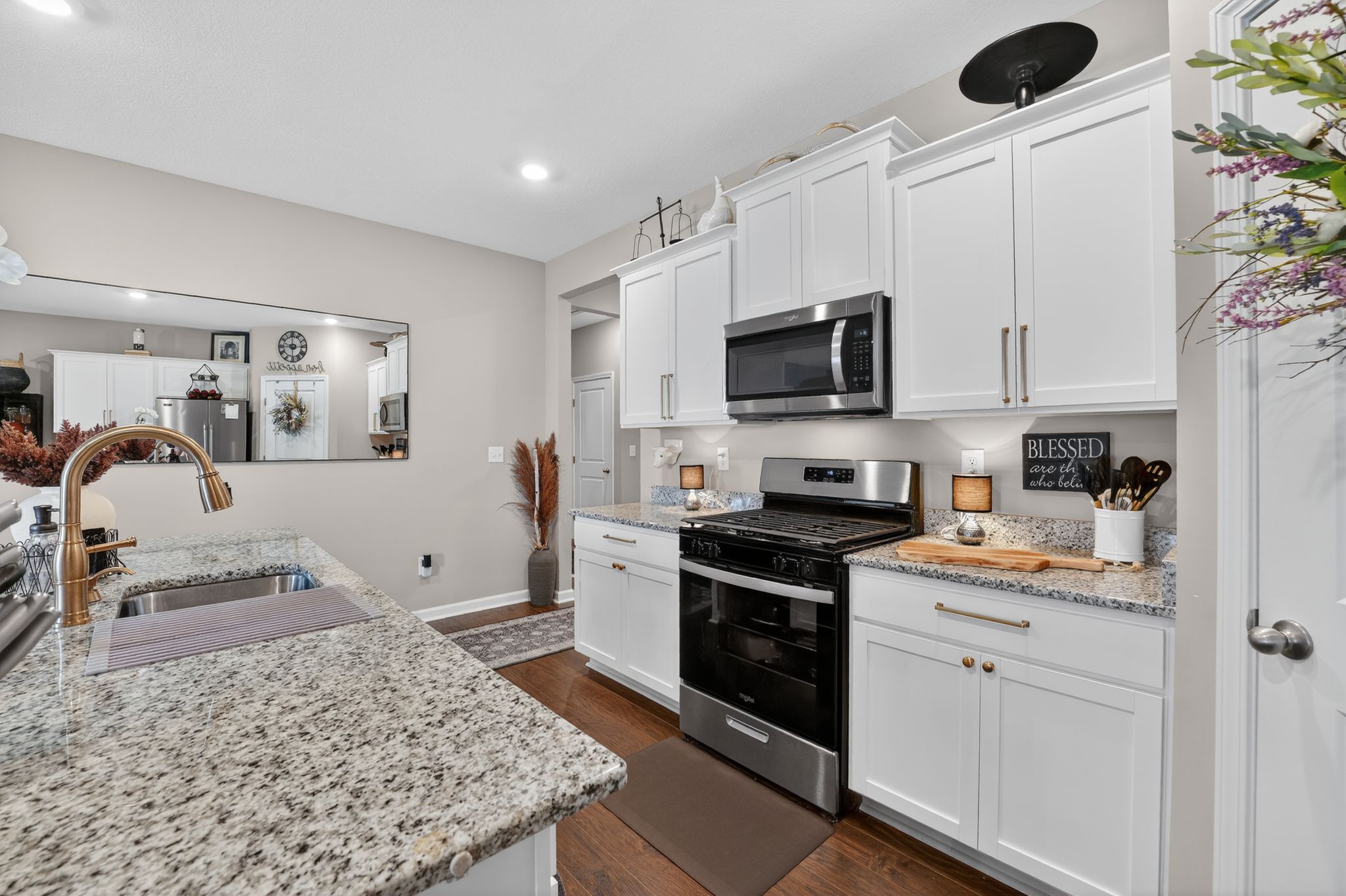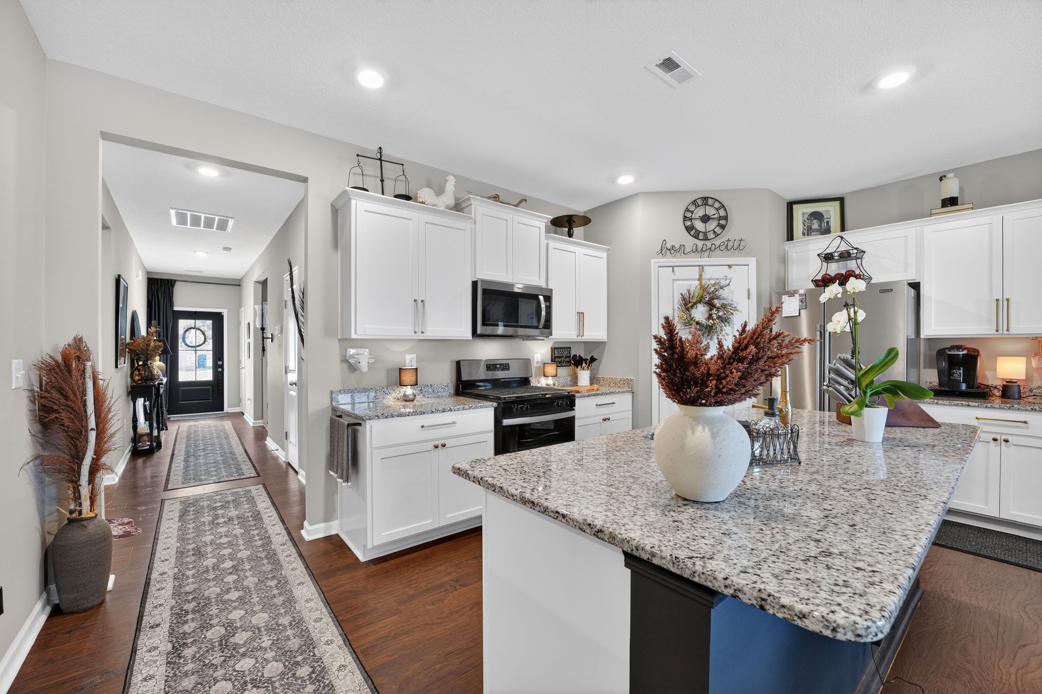 The spacious kitchen is a standout feature, complete with stainless steel appliances, granite countertops, a large center island, and a generous corner walk-in pantry. Whether you’re preparing weeknight dinners or hosting family and friends, this kitchen offers both style and functionality.