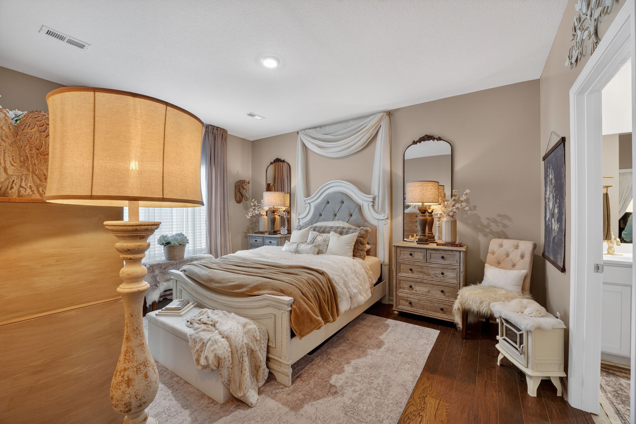 The private primary suite serves as a relaxing retreat with an oversized walk-in closet with custom built-ins and a beautifully appointed ensuite bath featuring dual vanities, a walk-in shower, and a separate water closet.